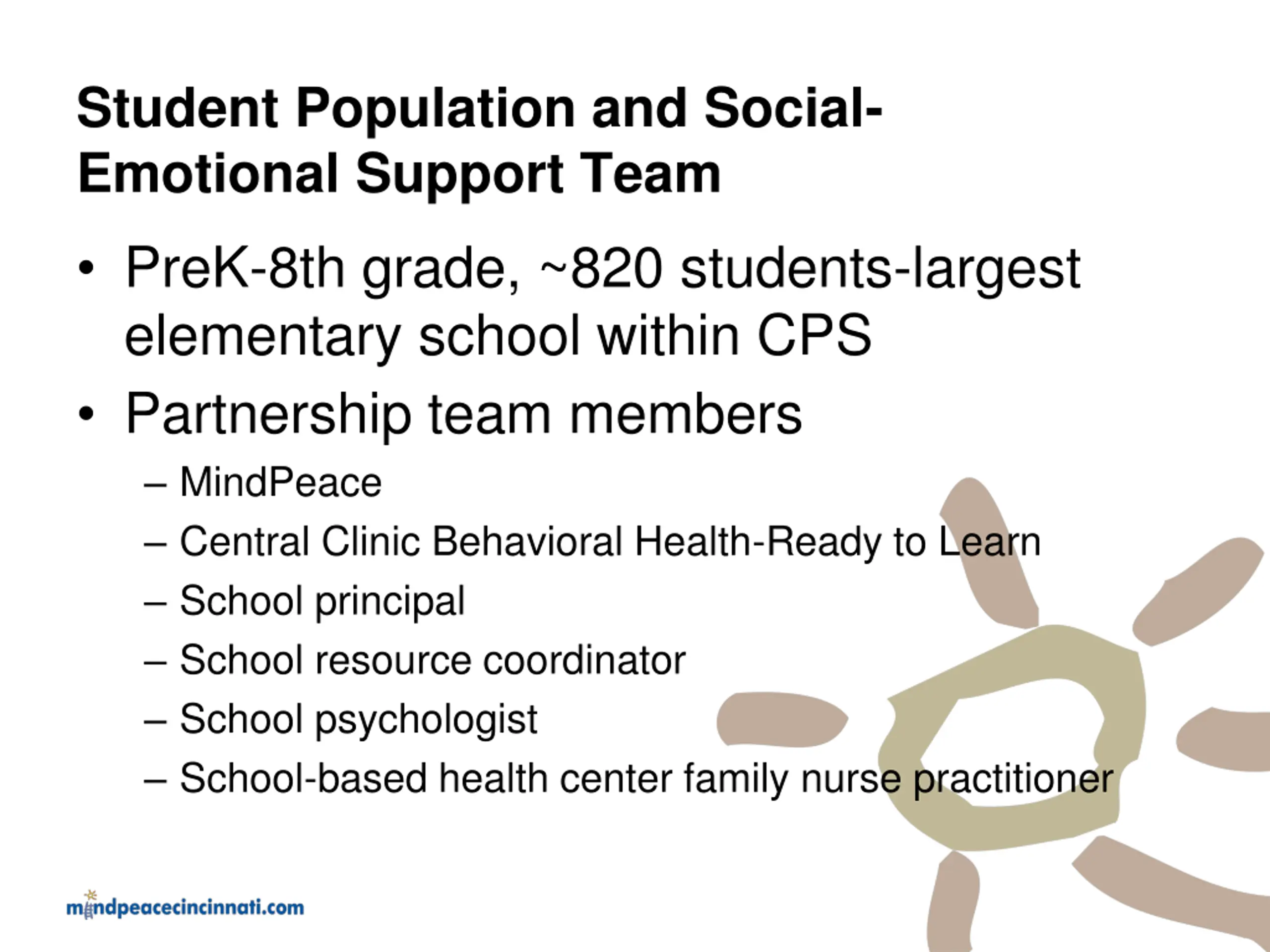 Student Population and Social- Emotional Support Team PreK-8th grade, ~820 students-largest elementary school within CPS Partnership team members MindPeace Central Clinic Behavioral Health-Ready to Learn School principal School resource coordinator School psychologist School-based health center family nurse practitioner