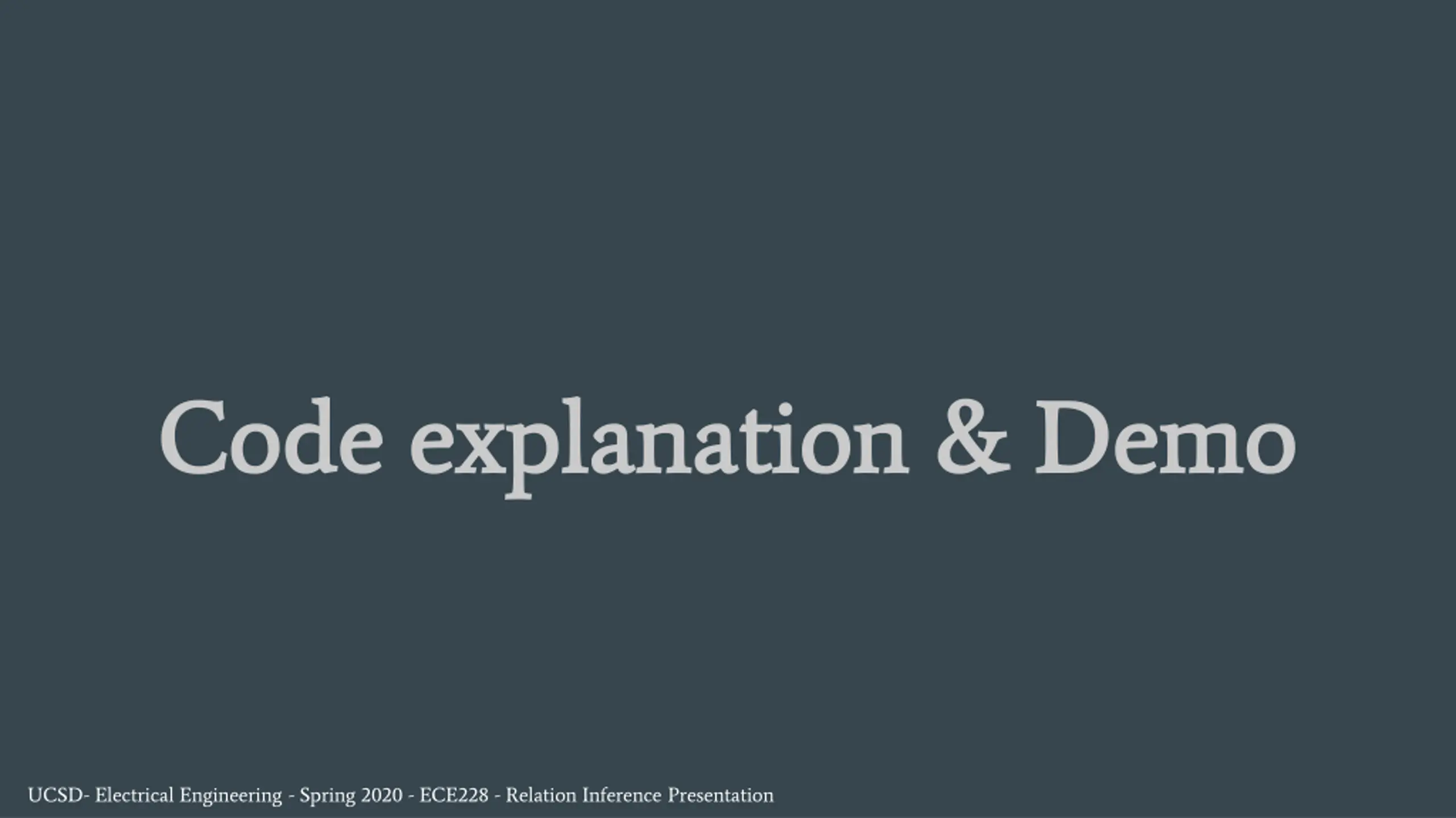 Code explanation & Demo Code explanation & Demo UCSD- Electrical Engineering - Spring 2020 - ECE228 - Relation Inference Presentation