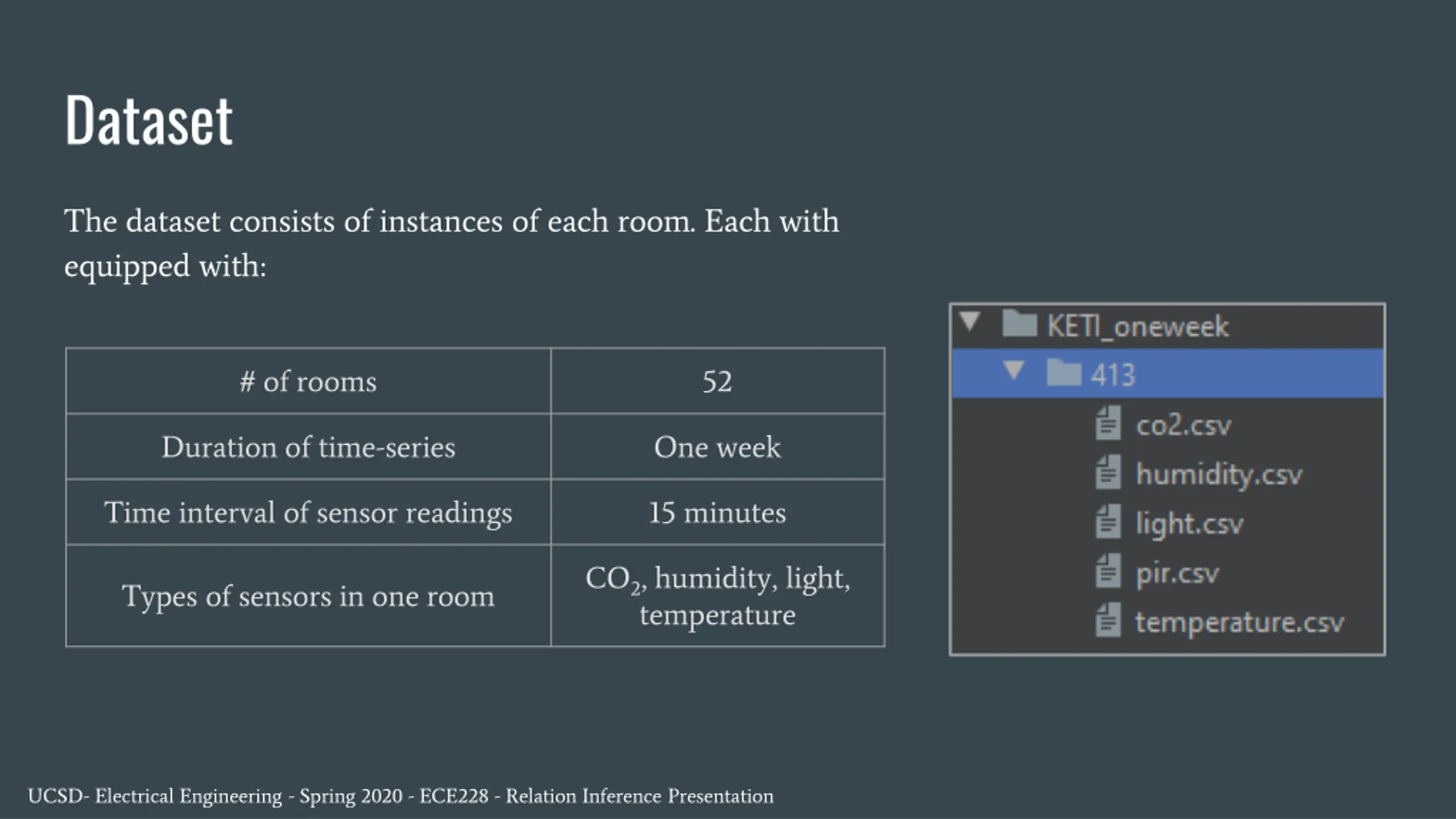 Dataset The dataset consists of instances of each room. Each with equipped with: # of rooms 52 Duration of time-series One week Time interval of sensor readings 15 minutes CO2, humidity, light, temperature Types of sensors in one room UCSD- Electrical Engineering - Spring 2020 - ECE228 - Relation Inference Presentation