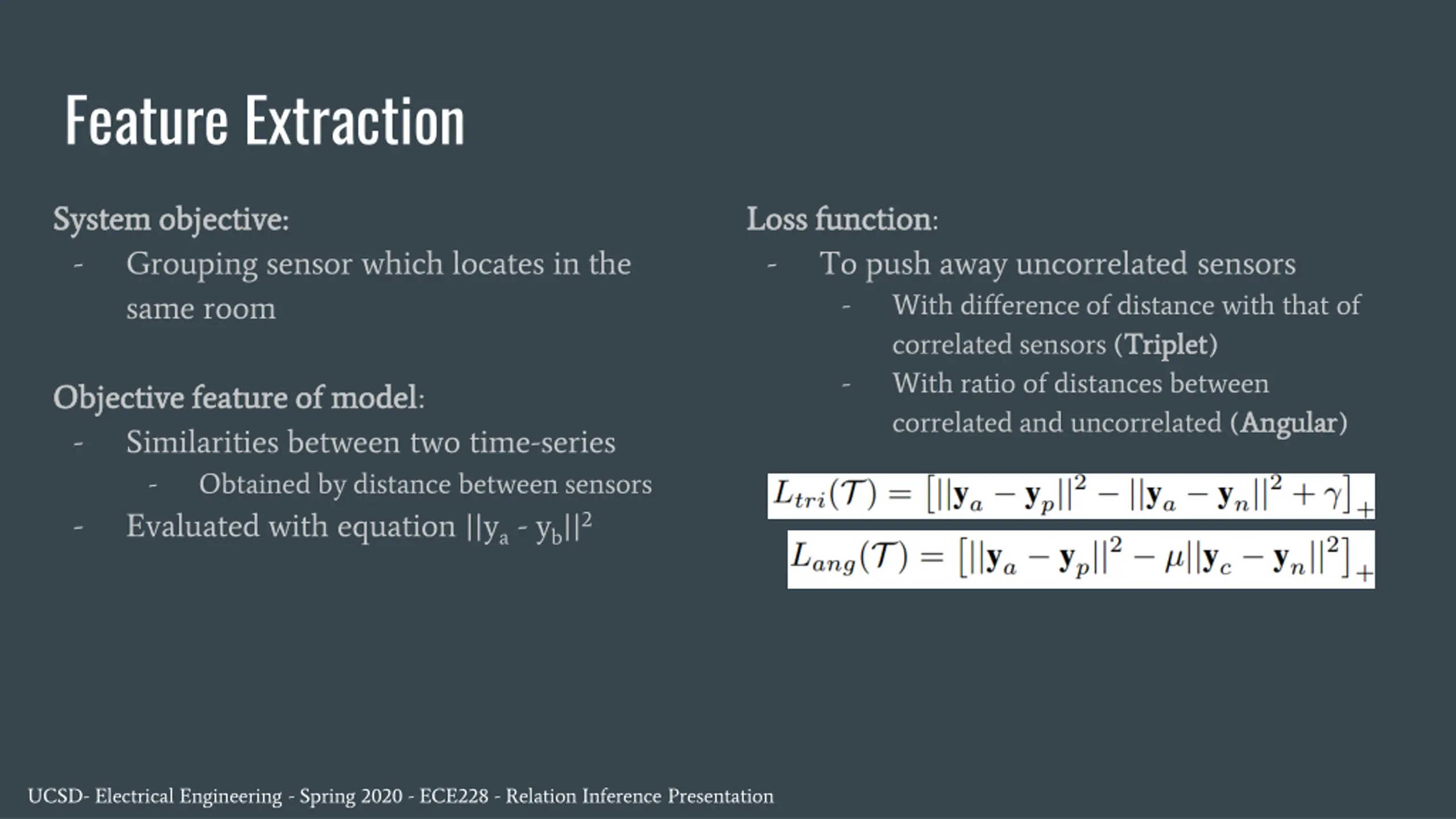 Feature Extraction System objective: System objective: - Grouping sensor which locates in the same room Loss function Loss function: - To push away uncorrelated sensors - With difference of distance with that of correlated sensors (Triplet - With ratio of distances between correlated and uncorrelated (Angular Triplet) Objective feature of model Objective feature of model: - Similarities between two time-series - Obtained by distance between sensors - Evaluated with equation ||ya- yb||2 Angular) UCSD- Electrical Engineering - Spring 2020 - ECE228 - Relation Inference Presentation