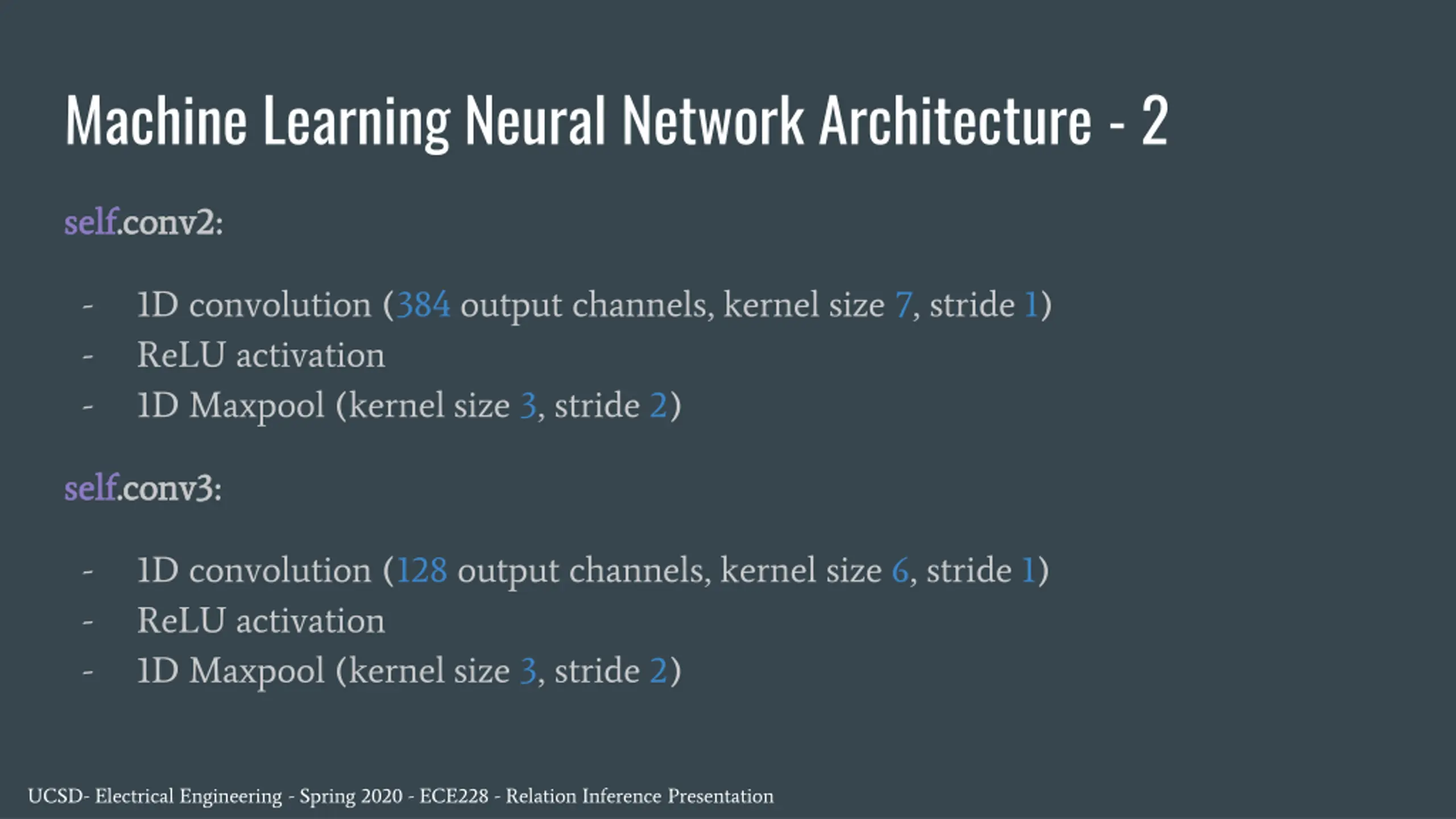 Machine Learning Neural Network Architecture - 2 self self.conv2: .conv2: - - - 1D convolution (384 output channels, kernel size 7, stride 1) ReLU activation 1D Maxpool (kernel size 3, stride 2) self self.conv3: .conv3: - - - 1D convolution (128 output channels, kernel size 6, stride 1) ReLU activation 1D Maxpool (kernel size 3, stride 2) UCSD- Electrical Engineering - Spring 2020 - ECE228 - Relation Inference Presentation
