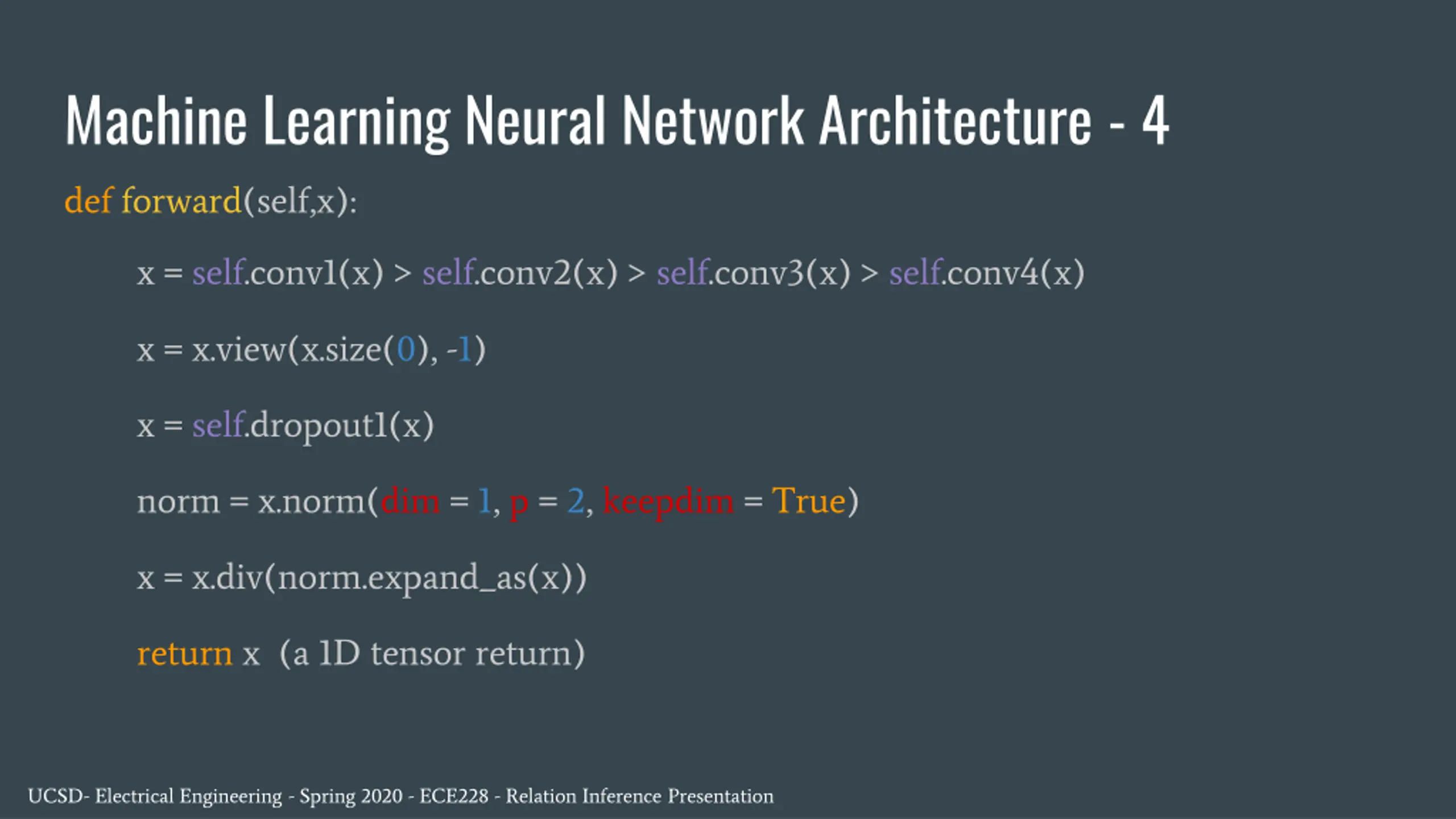 Machine Learning Neural Network Architecture - 4 def forward(self,x): x = self.conv1(x) > self.conv2(x) > self.conv3(x) > self.conv4(x) x = x.view(x.size(0), -1) x = self.dropout1(x) norm = x.norm(dim = 1, p = 2, keepdim = True) x = x.div(norm.expand_as(x)) return x (a 1D tensor return) UCSD- Electrical Engineering - Spring 2020 - ECE228 - Relation Inference Presentation