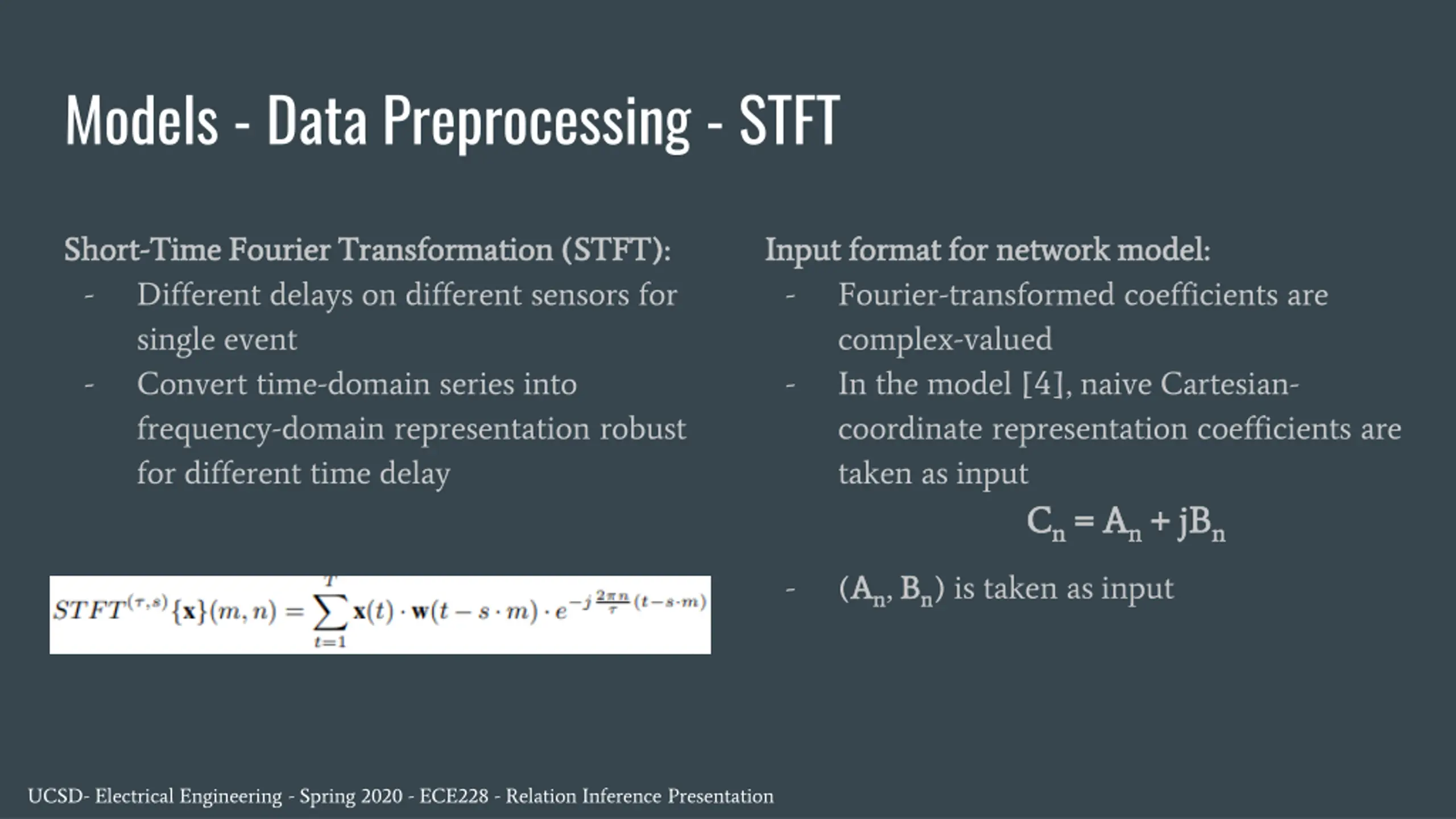 Models - Data Preprocessing - STFT Short Short- -Time Fourier Transformation (STFT): Time Fourier Transformation (STFT): - Different delays on different sensors for single event - Convert time-domain series into frequency-domain representation robust for different time delay Input format for network model: Input format for network model: - Fourier-transformed coefficients are complex-valued - In the model [4], naive Cartesian- coordinate representation coefficients are taken as input C Cn n= A = An n+ jB + jBn n - (A An n, B Bn n) is taken as input UCSD- Electrical Engineering - Spring 2020 - ECE228 - Relation Inference Presentation