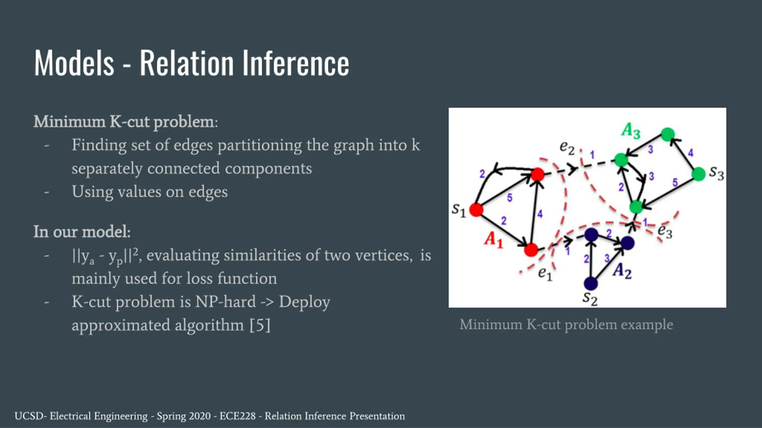 Models - Relation Inference Minimum K Minimum K- -cut problem - Finding set of edges partitioning the graph into k separately connected components - Using values on edges cut problem: In our model: In our model: - ||ya- yp||2, evaluating similarities of two vertices, is mainly used for loss function - K-cut problem is NP-hard -> Deploy approximated algorithm [5] Minimum K-cut problem example UCSD- Electrical Engineering - Spring 2020 - ECE228 - Relation Inference Presentation