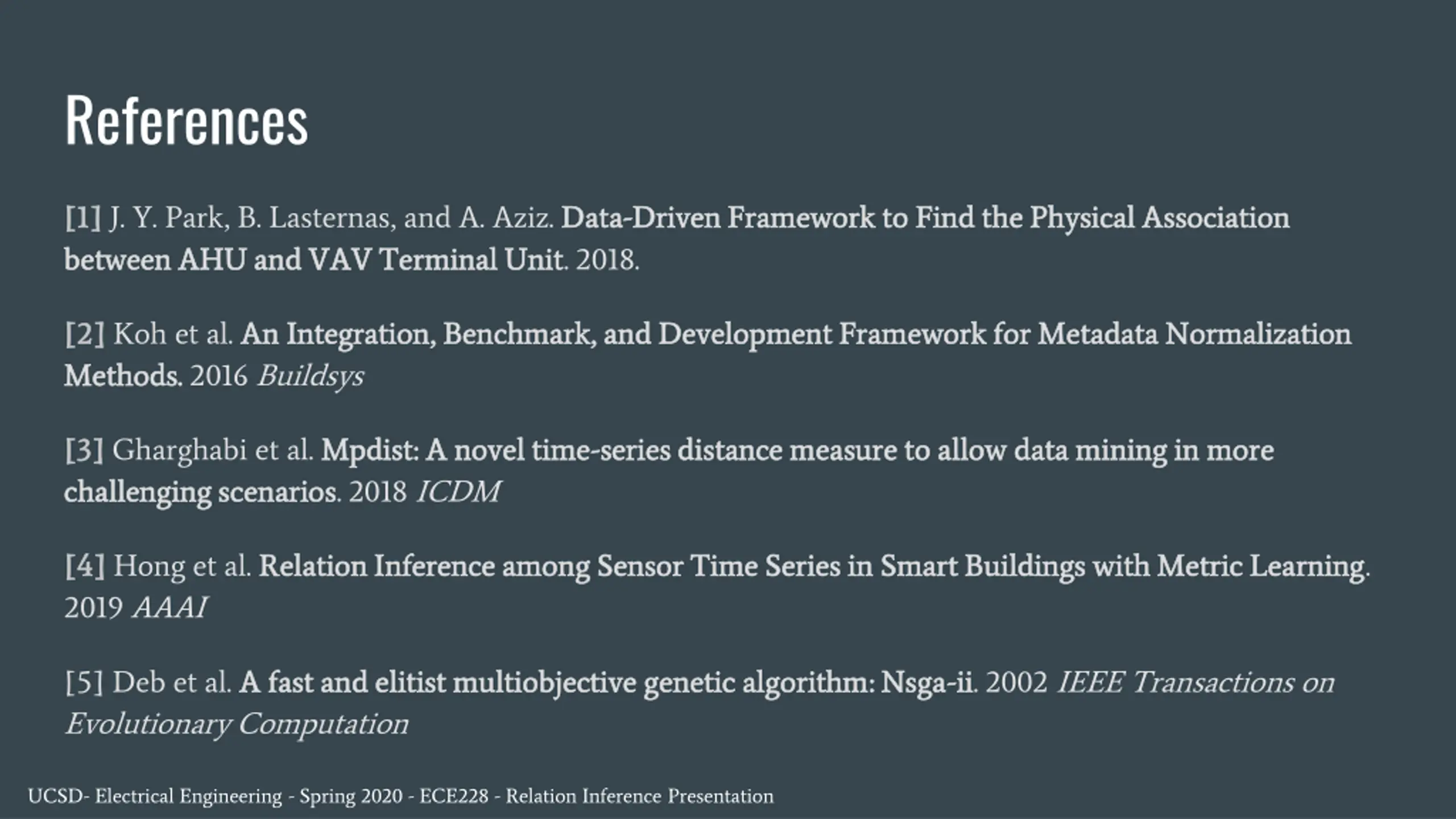References [1] [1] J. Y. Park, B. Lasternas, and A. Aziz. Data between AHU and VAV Terminal Unit between AHU and VAV Terminal Unit. 2018. Data- -Driven Framework to Find the Physical Association Driven Framework to Find the Physical Association [2] [2] Koh et al. An Integration, Benchmark, and Development Framework for Metadata Normalization An Integration, Benchmark, and Development Framework for Metadata Normalization Methods. Methods. 2016 Buildsys [3] [3] Gharghabi et al. Mpdist: A novel time Mpdist: A novel time- -series distance measure to allow data mining in more series distance measure to allow data mining in more challenging scenarios challenging scenarios. 2018 ICDM [4] [4] Hong et al. Relation Inference among Sensor Time Series in Smart Buildings with Metric Learning Relation Inference among Sensor Time Series in Smart Buildings with Metric Learning. 2019 AAAI [5] Deb et al. A fast and elitist multiobjective genetic algorithm: Nsga A fast and elitist multiobjective genetic algorithm: Nsga- -ii ii. 2002 IEEE Transactions on Evolutionary Computation UCSD- Electrical Engineering - Spring 2020 - ECE228 - Relation Inference Presentation