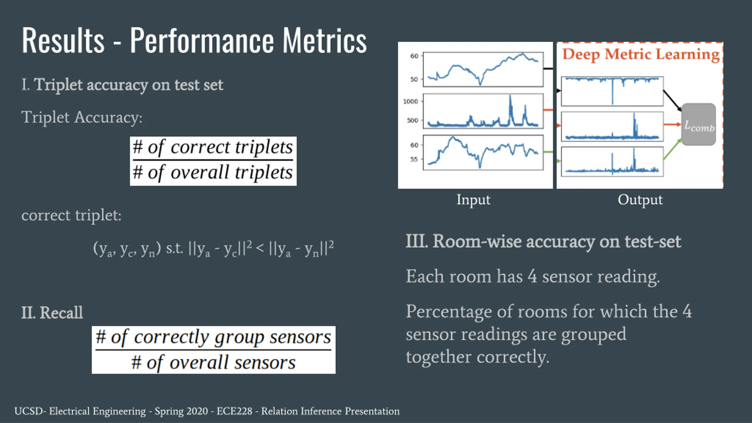 Results - Performance Metrics I. Triplet accuracy on test set Triplet accuracy on test set Triplet Accuracy: Input Output correct triplet: III. Room III. Room- -wise accuracy on test wise accuracy on test- -set set (ya, yc, yn) s.t. ||ya- yc||2 < ||ya- yn||2 Each room has 4 sensor reading. Percentage of rooms for which the 4 sensor readings are grouped together correctly. II. Recall II. Recall UCSD- Electrical Engineering - Spring 2020 - ECE228 - Relation Inference Presentation