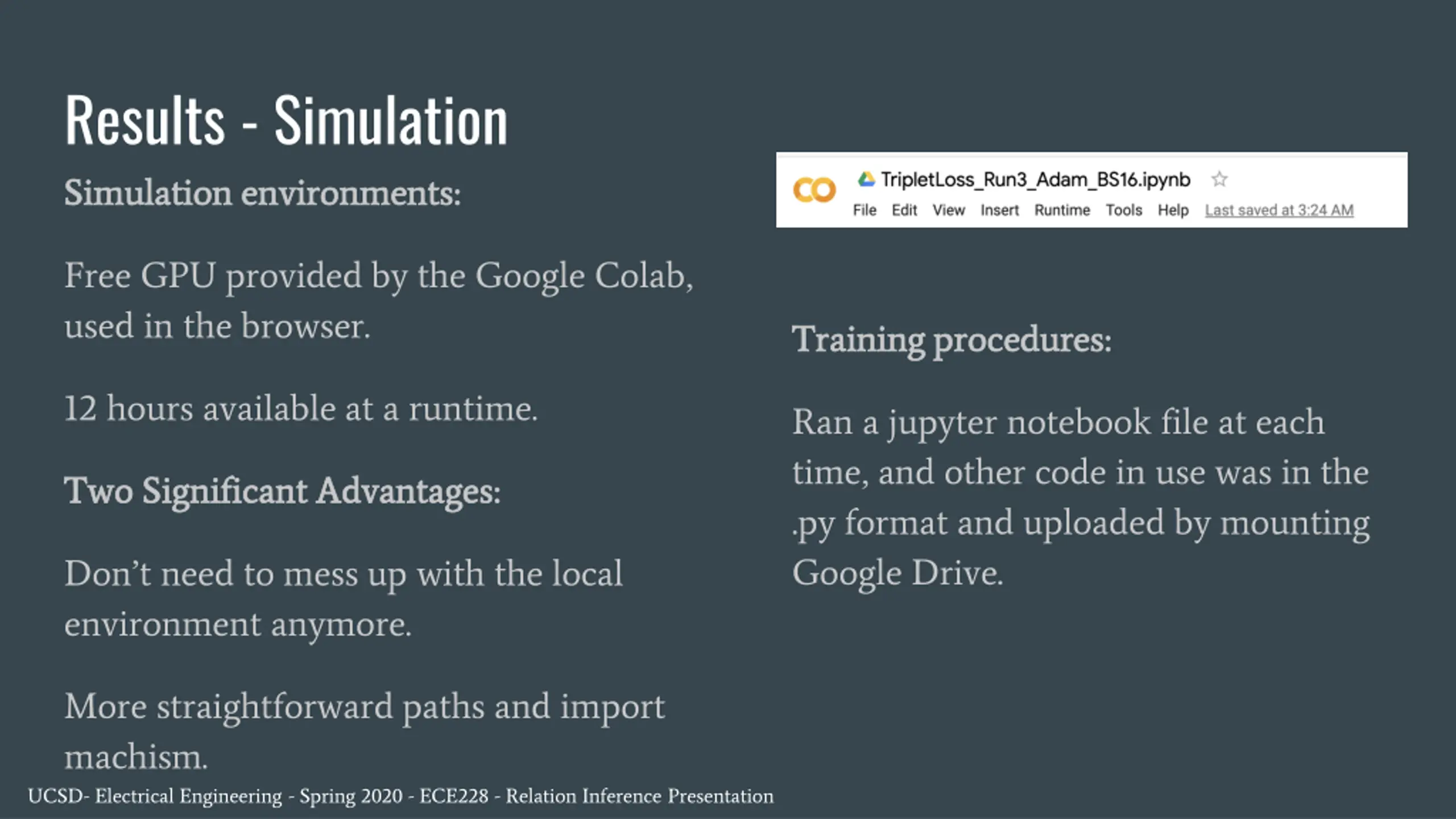 Results - Simulation Simulation environments: Simulation environments: Free GPU provided by the Google Colab, used in the browser. Training procedures: Training procedures: 12 hours available at a runtime. Ran a jupyter notebook file at each time, and other code in use was in the .py format and uploaded by mounting Google Drive. Two Significant Advantages: Two Significant Advantages: Don t need to mess up with the local environment anymore. More straightforward paths and import machism. UCSD- Electrical Engineering - Spring 2020 - ECE228 - Relation Inference Presentation
