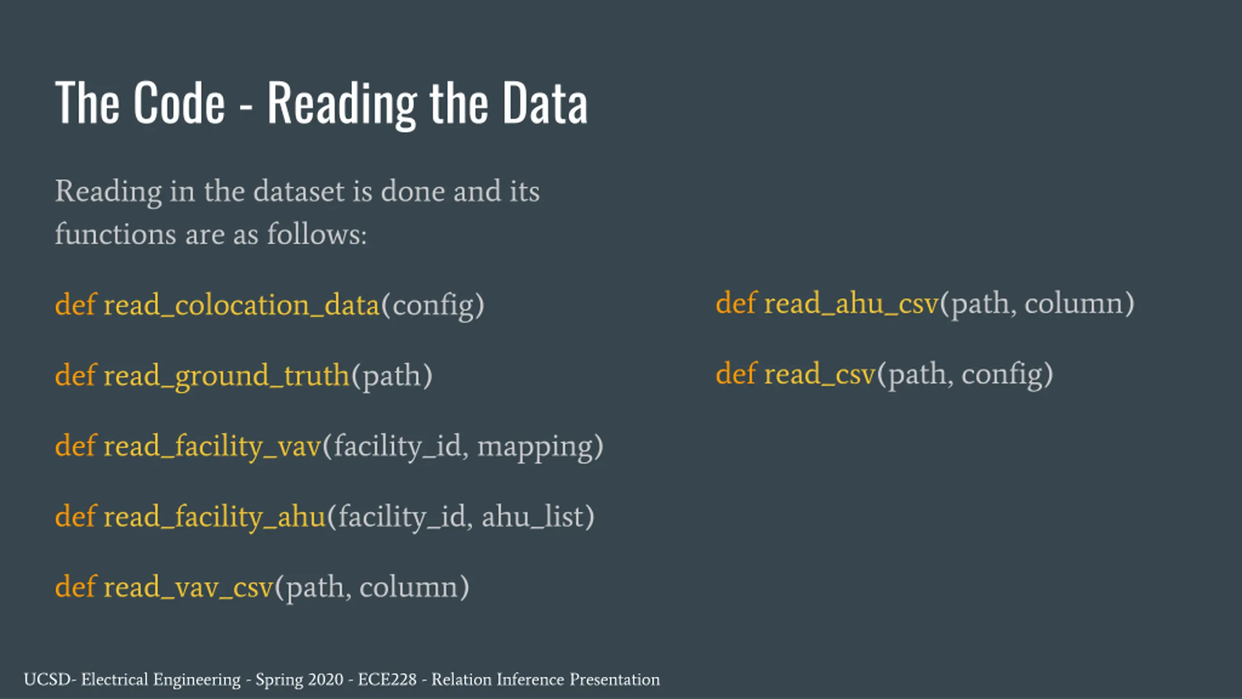 The Code - Reading the Data Reading in the dataset is done and its functions are as follows: def read_ahu_csv(path, column) def read_colocation_data(config) def read_csv(path, config) def read_ground_truth(path) def read_facility_vav(facility_id, mapping) def read_facility_ahu(facility_id, ahu_list) def read_vav_csv(path, column) UCSD- Electrical Engineering - Spring 2020 - ECE228 - Relation Inference Presentation