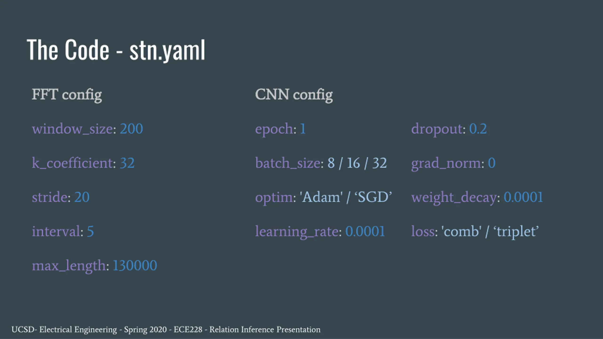 The Code - stn.yaml FFT config FFT config CNN config CNN config window_size: 200 epoch: 1 dropout: 0.2 k_coefficient: 32 batch_size: 8 / 16 / 32 grad_norm: 0 stride: 20 optim: 'Adam' / SGD weight_decay: 0.0001 interval: 5 learning_rate: 0.0001 loss: 'comb' / triplet max_length: 130000 UCSD- Electrical Engineering - Spring 2020 - ECE228 - Relation Inference Presentation