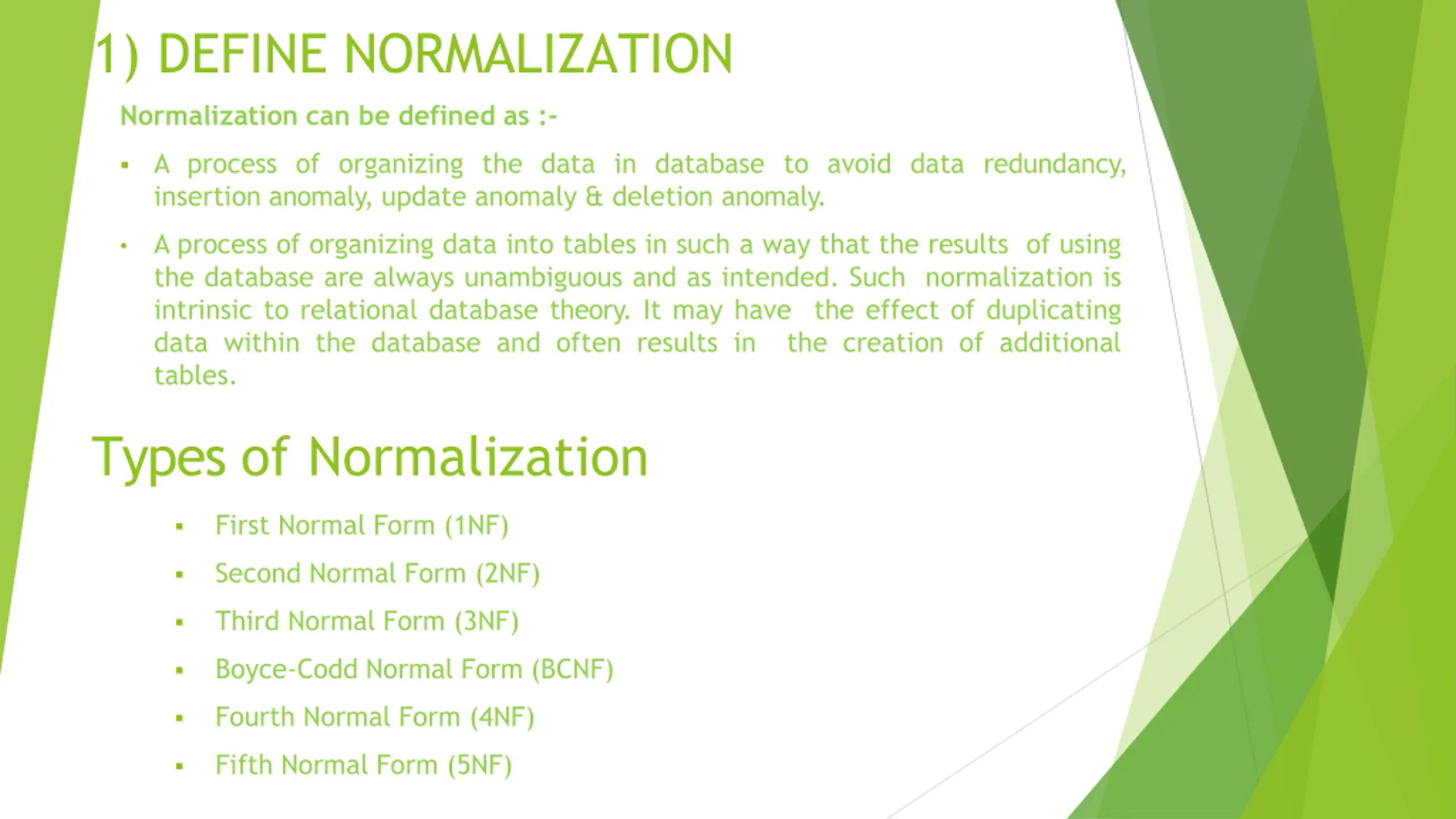 1) DEFINE NORMALIZATION Normalization can be defined as :- A process of organizing the data in database to avoid data redundancy, insertion anomaly, update anomaly & deletion anomaly. A process of organizing data into tables in such a way that the results of using the database are always unambiguous and as intended. Such normalization is intrinsic to relational database theory. It may have the effect of duplicating data within the database and often results in tables. the creation of additional Types of Normalization First Normal Form (1NF) Second Normal Form (2NF) Third Normal Form (3NF) Boyce-Codd Normal Form (BCNF) Fourth Normal Form (4NF) Fifth Normal Form (5NF)