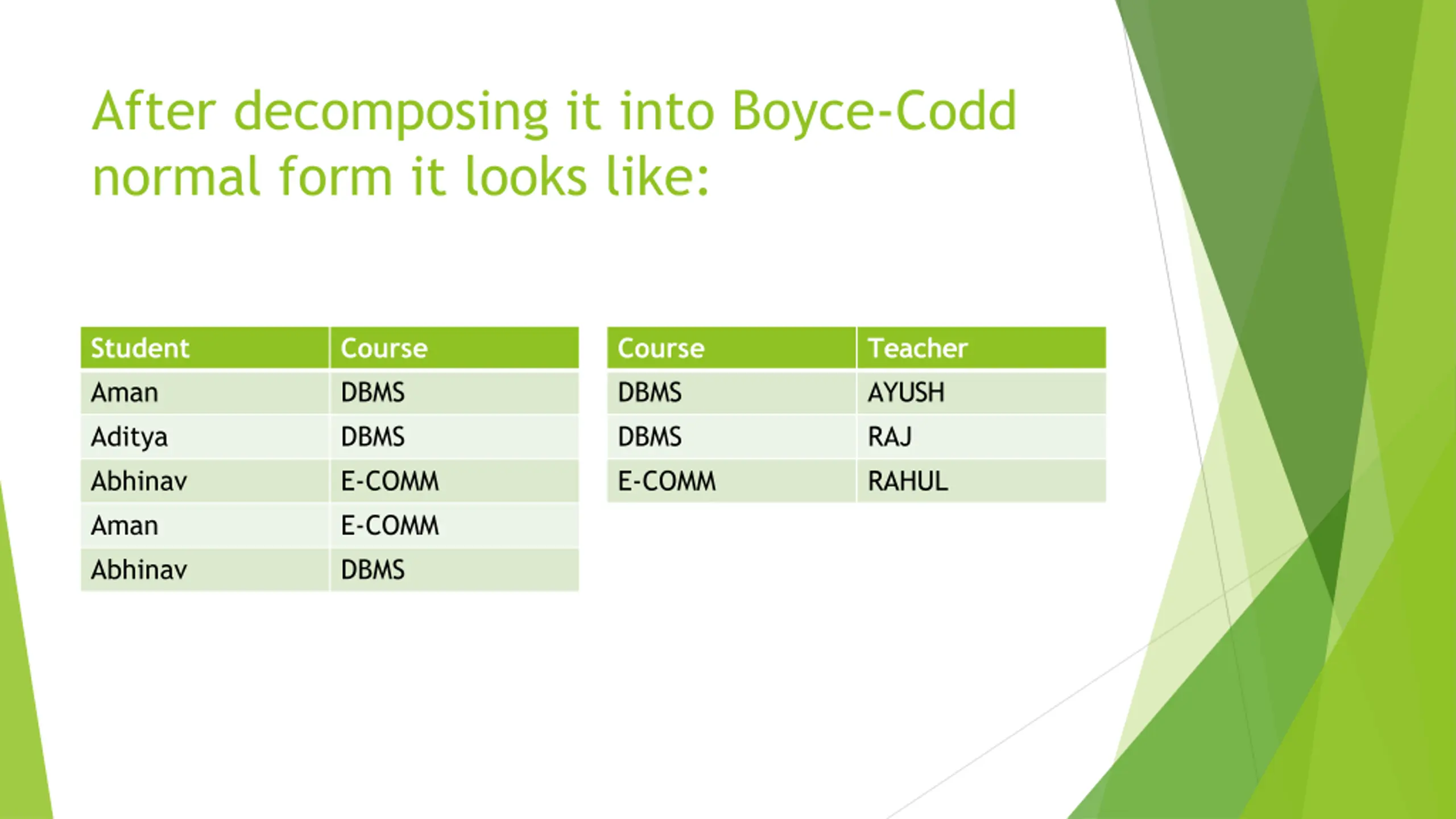 After decomposing it into Boyce-Codd normal form it looks like: Student Aman Aditya Abhinav Aman Abhinav Course DBMS DBMS E-COMM E-COMM DBMS Course DBMS DBMS E-COMM Teacher AYUSH RAJ RAHUL