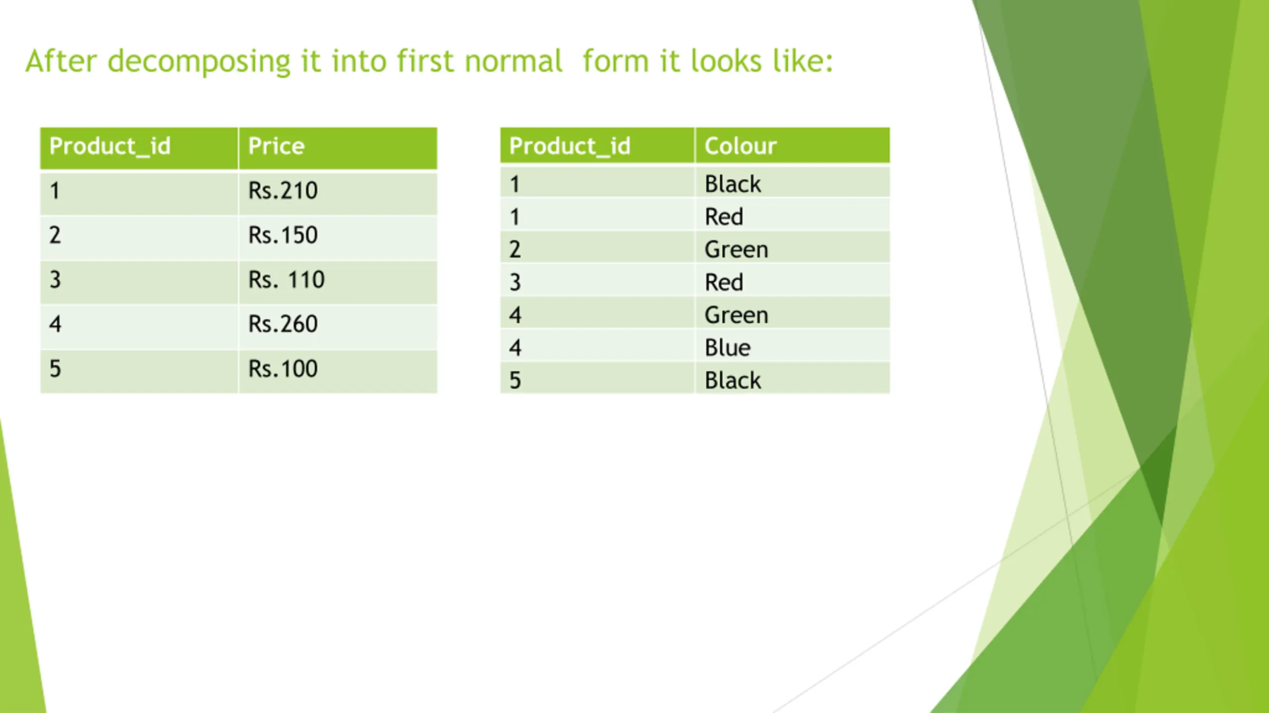 After decomposing it into first normal form it looks like: Product_id Price Product_id 1 1 2 3 4 4 5 Colour Black Red Green Red Green Blue Black 1 Rs.210 2 Rs.150 3 Rs. 110 4 Rs.260 5 Rs.100