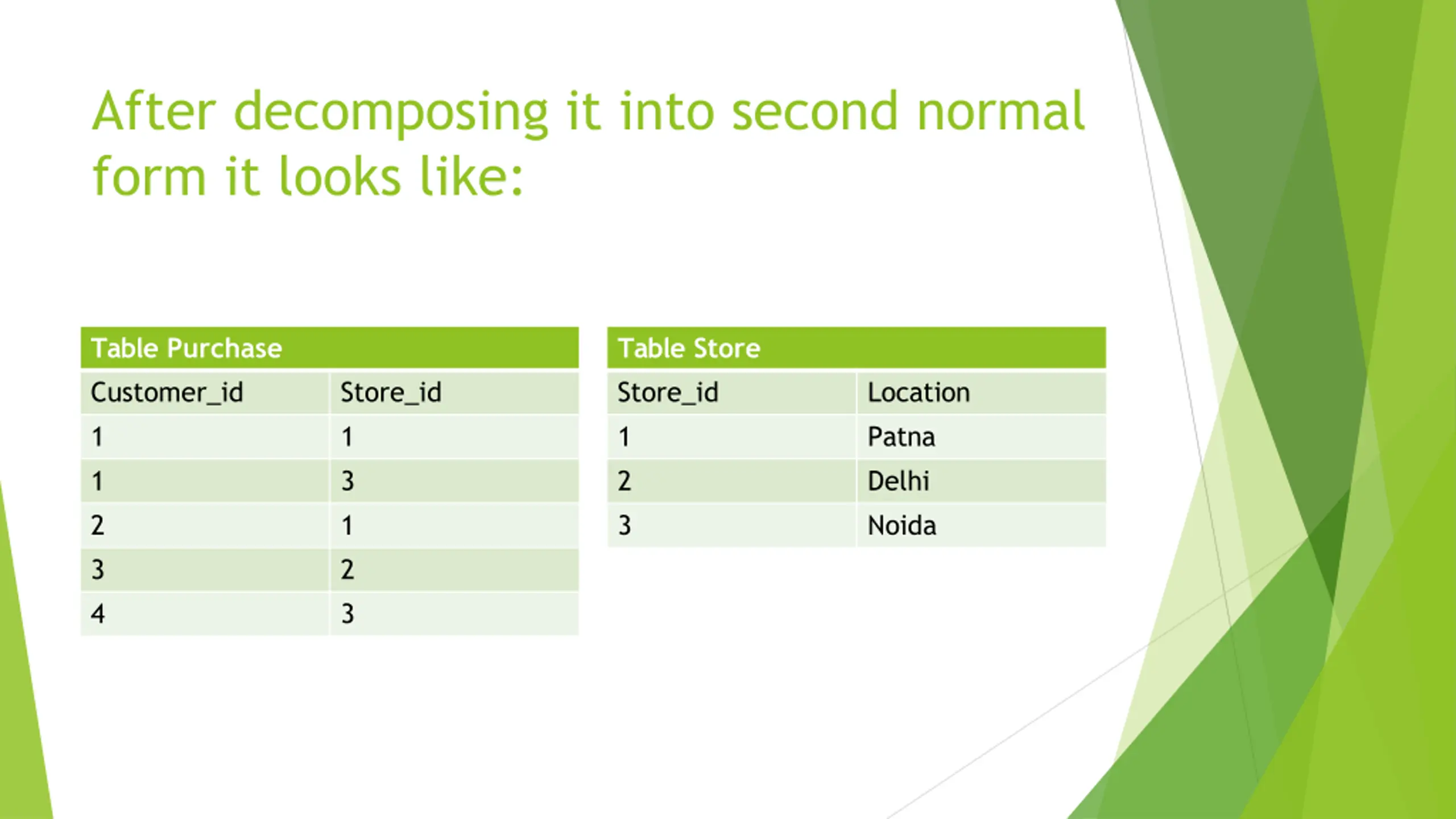 After decomposing it into second normal form it looks like: Table Purchase Customer_id 1 1 2 3 4 Table Store Store_id 1 2 3 Store_id 1 3 1 2 3 Location Patna Delhi Noida