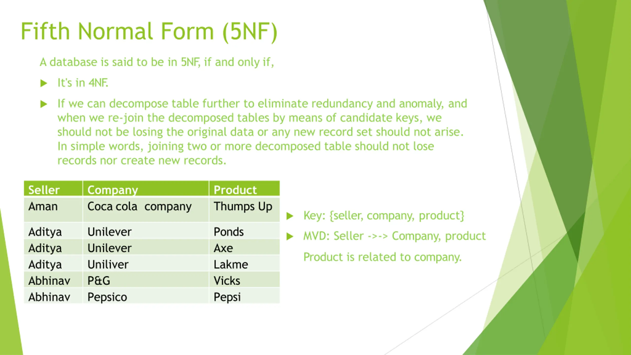 Fifth Normal Form (5NF) A database is said to be in 5NF , if and only if, It's in 4NF . If we can decompose table further to eliminate redundancy and anomaly, and when we re-join the decomposed tables by means of candidate keys, we should not be losing the original data or any new record set should not arise. In simple words, joining two or more decomposed table should not lose records nor create new records. Seller Aman Company Coca cola company Product Thumps Up Key: {seller, company, product} Aditya Aditya Aditya Abhinav Abhinav Unilever Unilever Uniliver P&G Pepsico Ponds Axe Lakme Vicks Pepsi MVD: Seller ->-> Company, product Product is related to company.