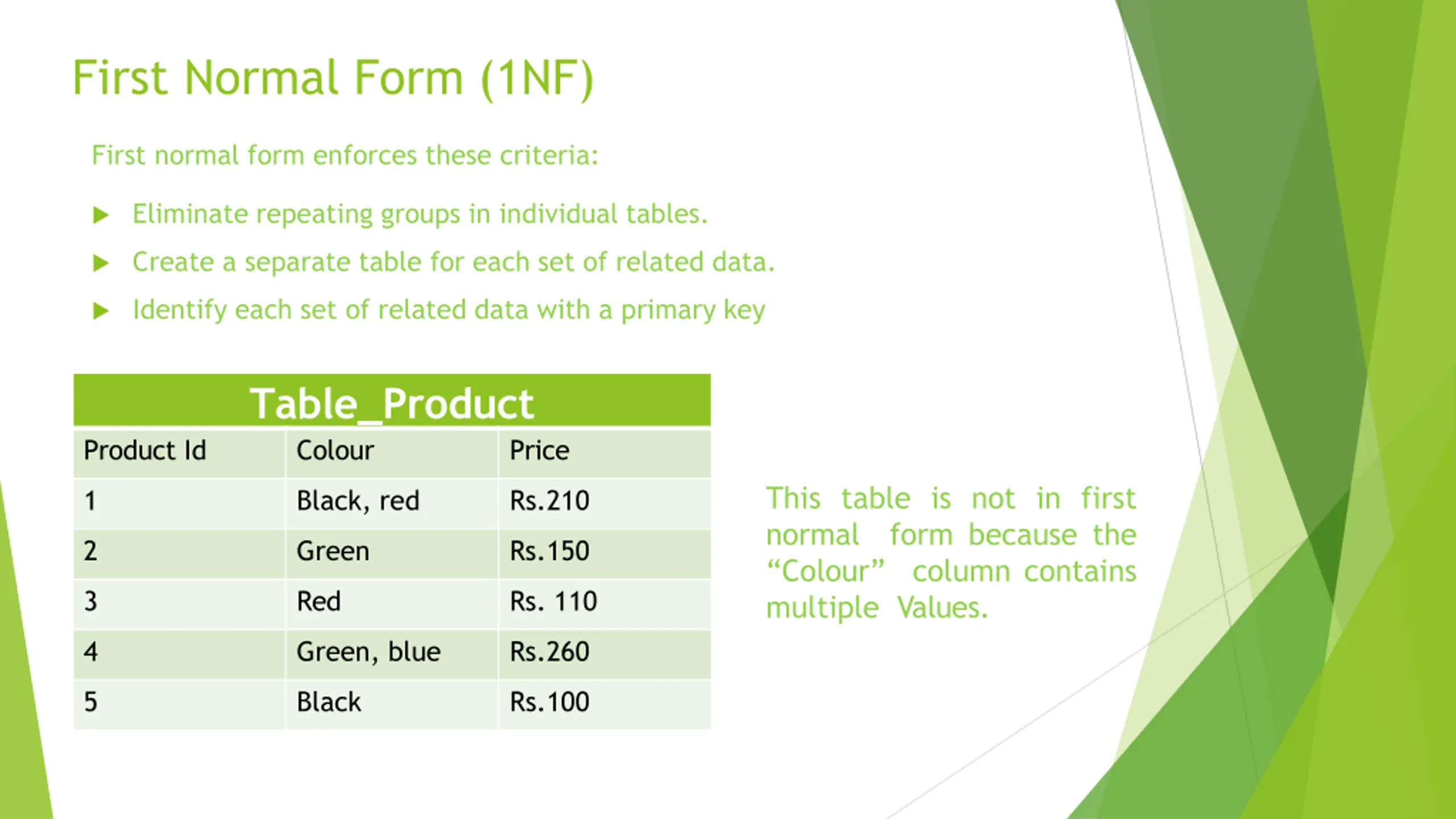 First Normal Form (1NF) First normal form enforces these criteria: Eliminate repeating groups in individual tables. Create a separate table for each set of related data. Identify each set of related data with a primary key Table_Product Colour Product Id Price This table is not in first normal form because the Colour column contains multiple Values. 1 Black, red Rs.210 2 Green Rs.150 3 Red Rs. 110 4 Green, blue Rs.260 5 Black Rs.100