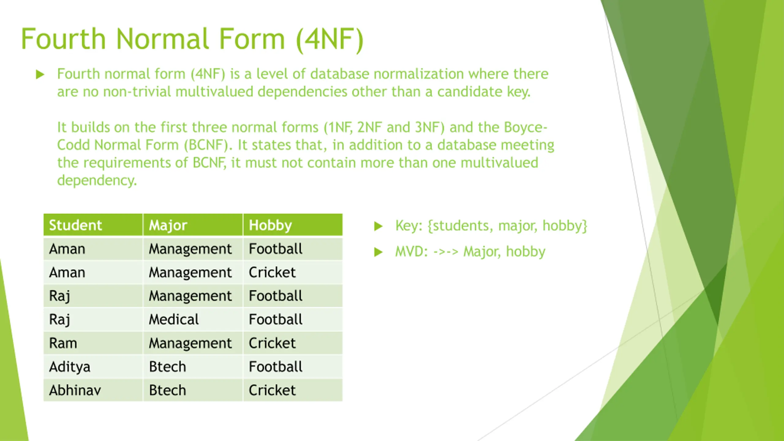 Fourth Normal Form (4NF) Fourth normal form (4NF) is a level of database normalization where there are no non-trivial multivalued dependencies other than a candidate key. It builds on the first three normal forms (1NF , 2NF and 3NF) and the Boyce- Codd Normal Form (BCNF). It states that, in addition to a database meeting the requirements of BCNF , it must not contain more than one multivalued dependency. Student Aman Aman Raj Raj Ram Aditya Abhinav Major Management Management Management Medical Management Btech Btech Hobby Football Cricket Football Football Cricket Football Cricket Key: {students, major, hobby} MVD: ->-> Major, hobby