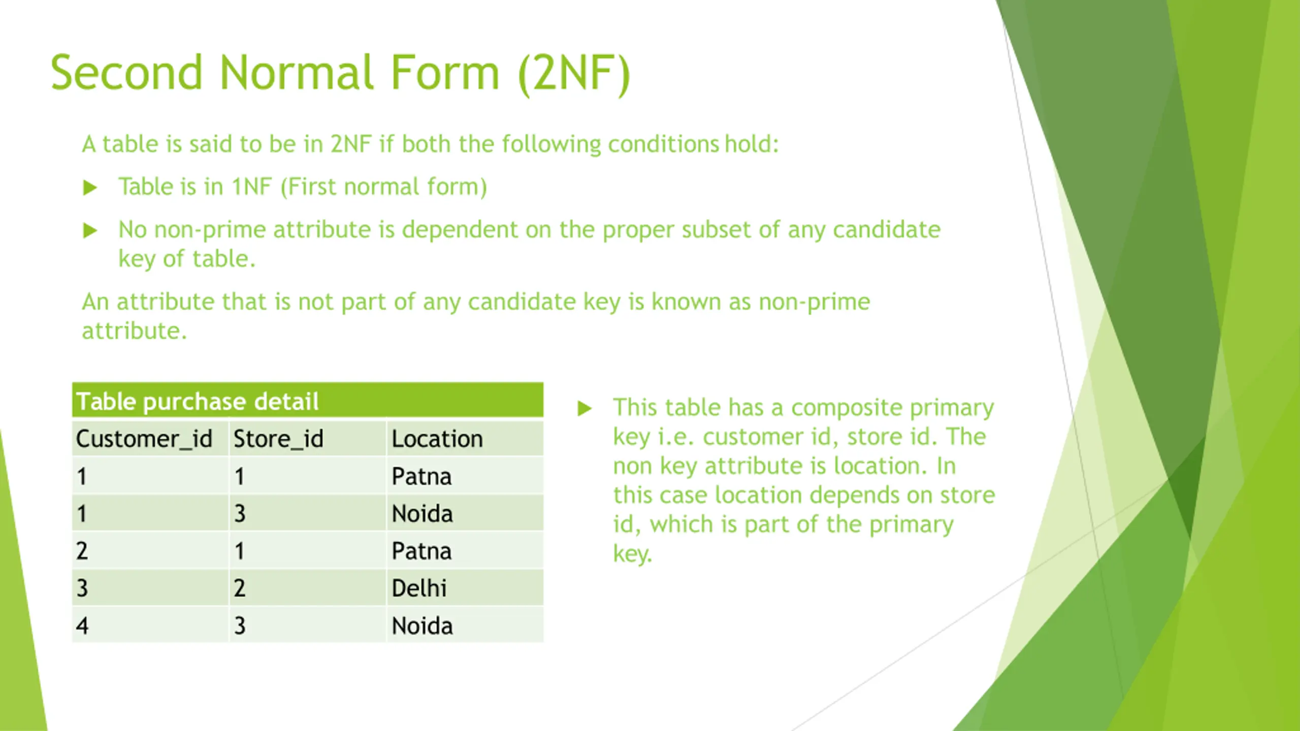 Second Normal Form (2NF) A table is said to be in 2NF if both the following conditionshold: Table is in 1NF (First normal form) No non-prime attribute is dependent on the proper subset of any candidate key of table. An attribute that is not part of any candidate key is known as non-prime attribute. Table purchase detail Customer_id Store_id 1 1 2 3 4 This table has a composite primary key i.e. customer id, store id. The non key attribute is location. In this case location depends on store id, which is part of the primary key. Location Patna Noida Patna Delhi Noida 1 3 1 2 3