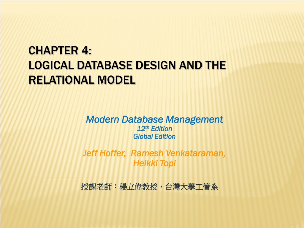 CHAPTER 4: LOGICAL DATABASE DESIGN AND THE RELATIONAL MODEL Modern Database Management Modern Database Management 12 12th thEdition Edition Global Edition Global Edition Jeff Hoffer, Ramesh Jeff Hoffer, Ramesh Venkataraman Heikki Heikki Topi Venkataraman, , Topi