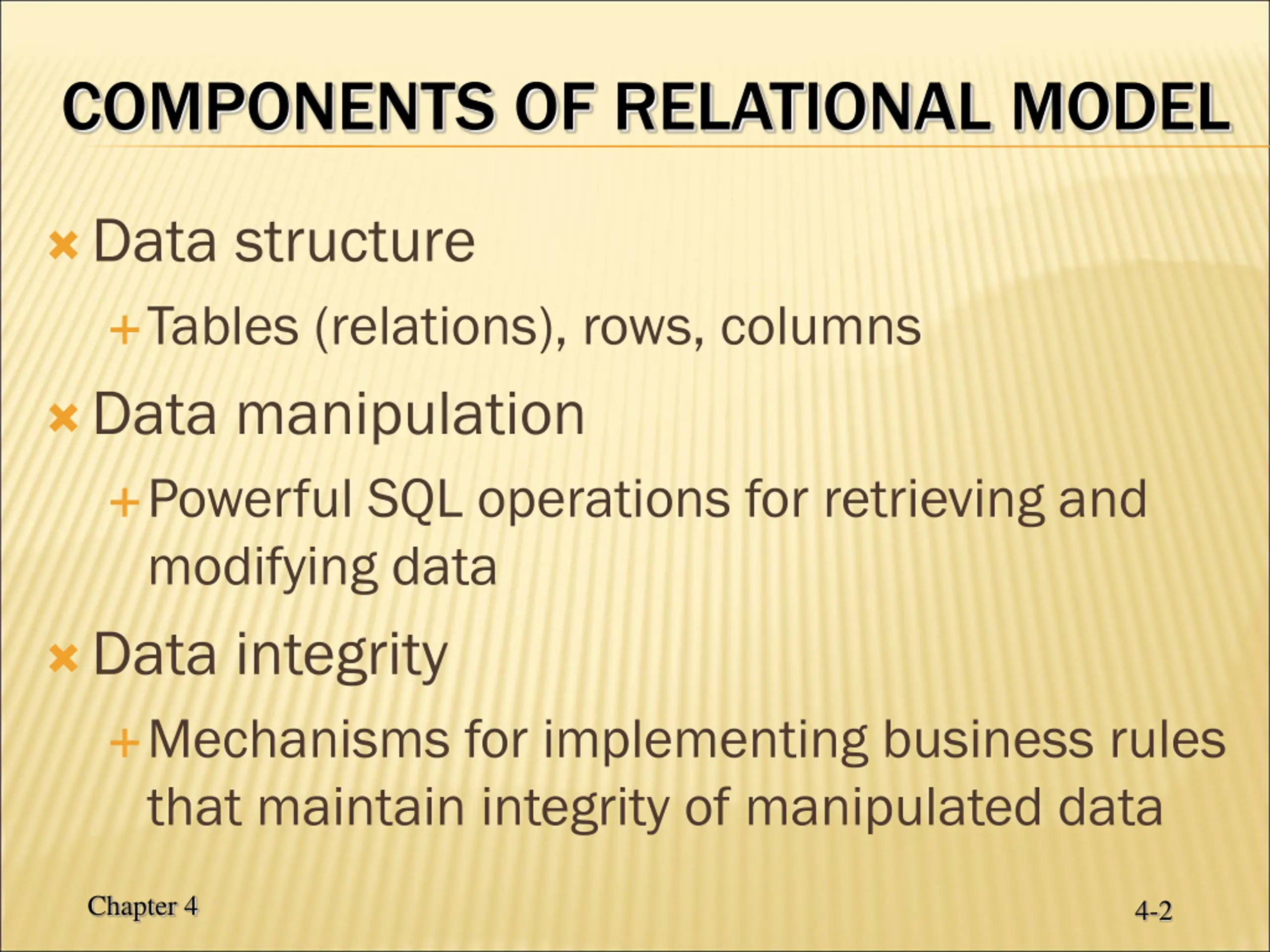 COMPONENTS OF RELATIONAL MODEL Data structure Tables (relations), rows, columns Data manipulation Powerful SQL operations for retrieving and modifying data Data integrity Mechanisms for implementing business rules that maintain integrity of manipulated data Chapter 4 4-2