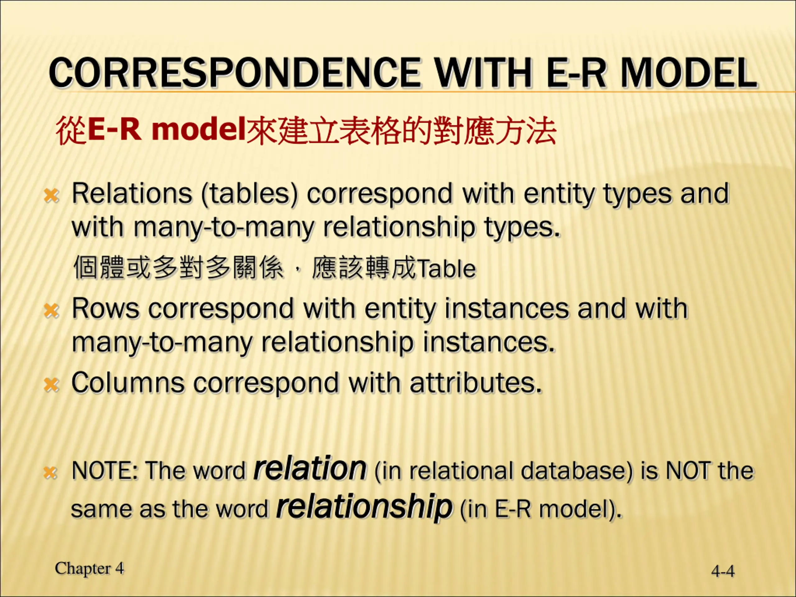 CORRESPONDENCE WITH E-R MODEL E-R model Relations (tables) correspond with entity types and with many-to-many relationship types. Table Rows correspond with entity instances and with many-to-many relationship instances. Columns correspond with attributes. NOTE: The word relation same as the word relationship relation (in relational database) is NOT the relationship (in E-R model). Chapter 4 4-4