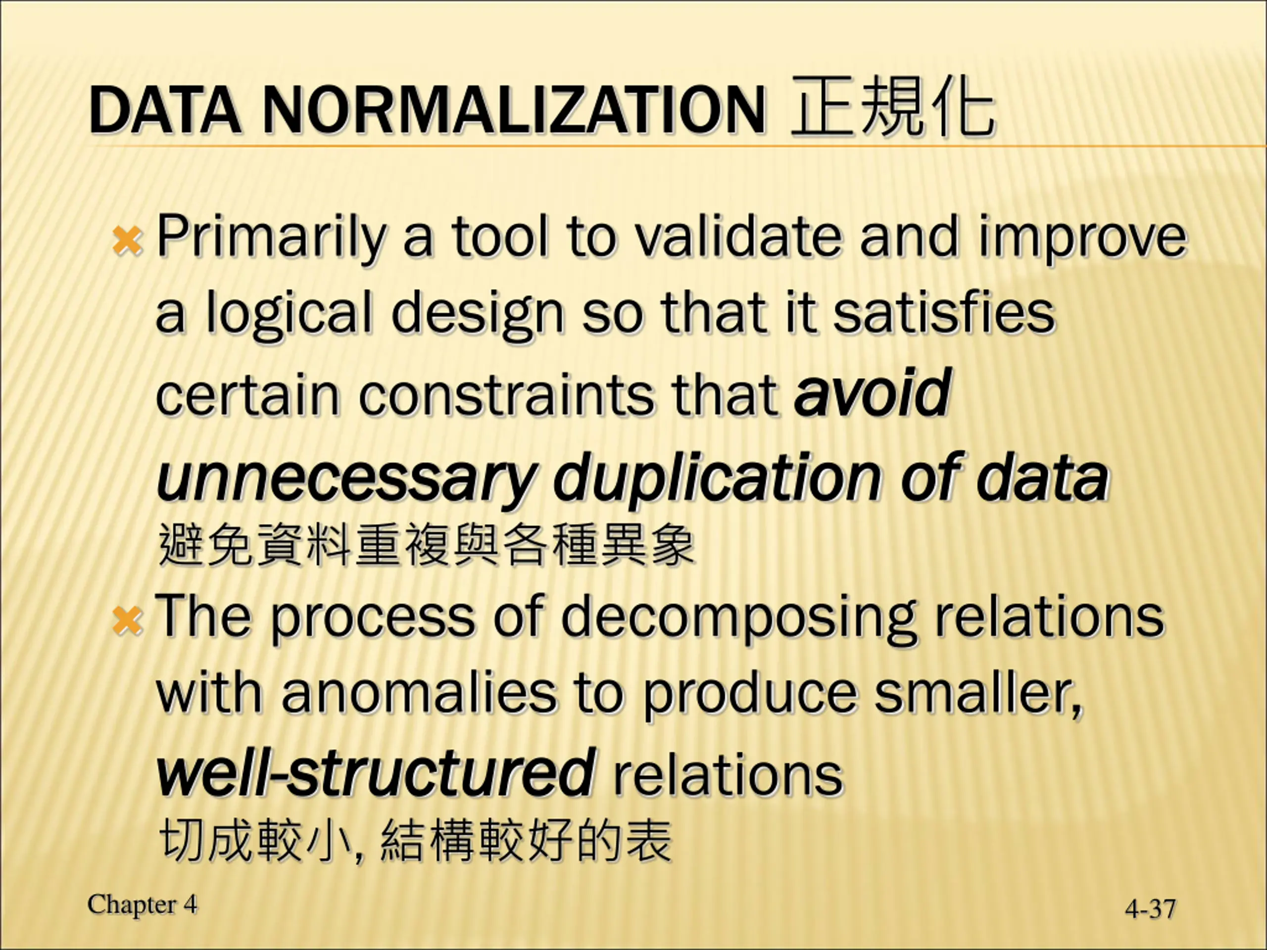 DATA NORMALIZATION Primarily a tool to validate and improve a logical design so that it satisfies certain constraints that avoid unnecessary duplication of data unnecessary duplication of data The process of decomposing relations with anomalies to produce smaller, well well- -structured structured relations , avoid Chapter 4 4-37