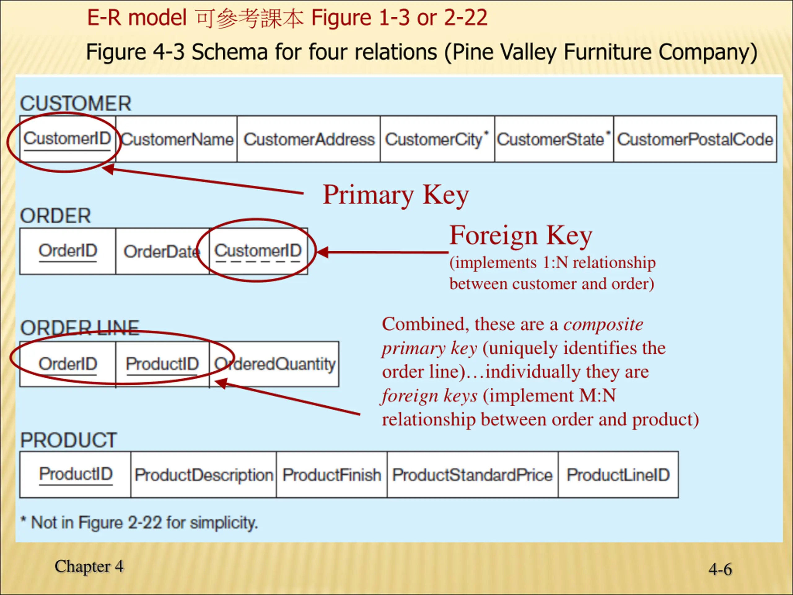 E-R model Figure 1-3 or 2-22 Figure 4-3 Schema for four relations (Pine Valley Furniture Company) Primary Key Foreign Key (implements 1:N relationship between customer and order) Combined, these are a composite primary key (uniquely identifies the order line) individually they are foreign keys (implement M:N relationship between order and product) Chapter 4 4-6