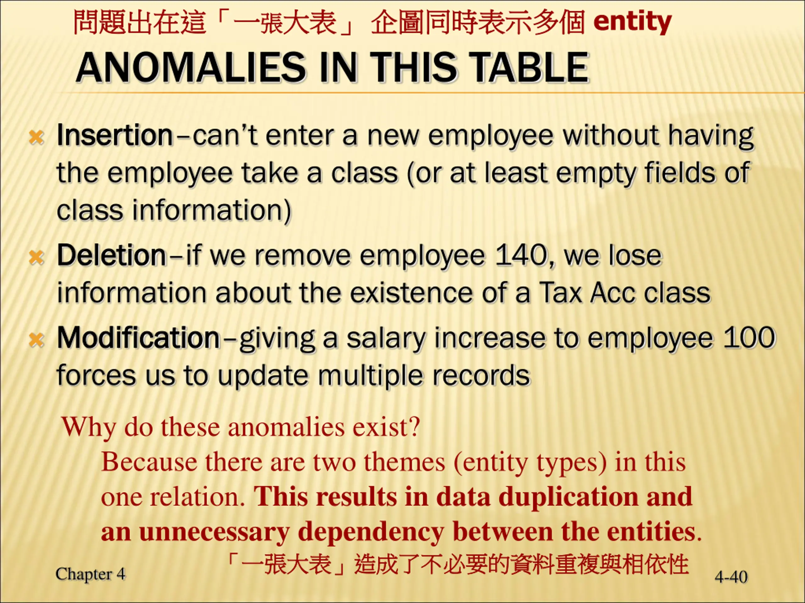 entity ANOMALIES IN THIS TABLE Insertion Insertion can t enter a new employee without having the employee take a class (or at least empty fields of class information) Deletion Deletion if we remove employee 140, we lose information about the existence of a Tax Acc class Modification Modification giving a salary increase to employee 100 forces us to update multiple records Why do these anomalies exist? Because there are two themes (entity types) in this one relation. This results in data duplication and an unnecessary dependency between the entities. Chapter 4 4-40