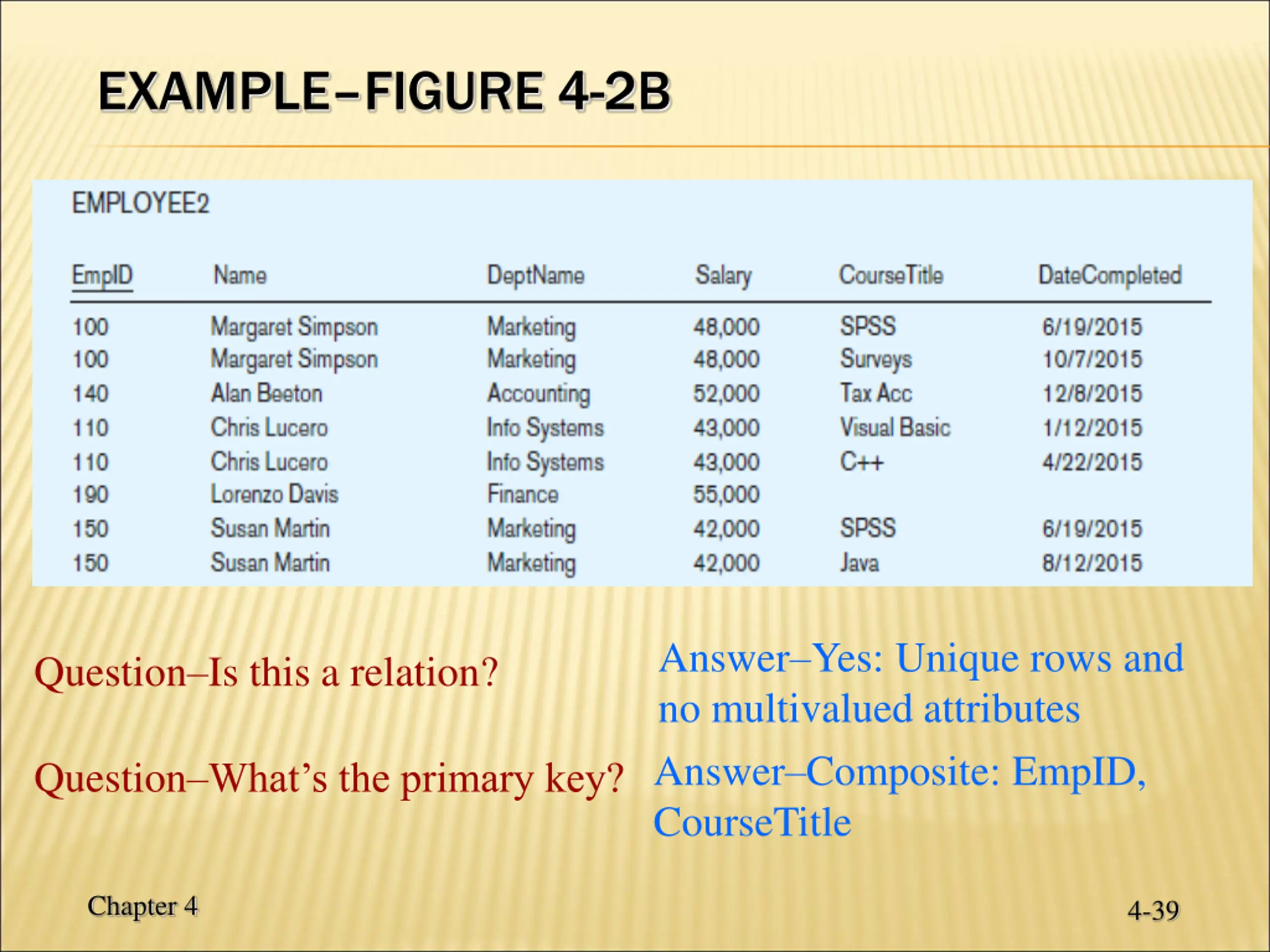 EXAMPLEFIGURE 4-2B Answer Yes: Unique rows and no multivalued attributes Question Is this a relation? Question What s the primary key? Answer Composite: EmpID, CourseTitle Chapter 4 4-39