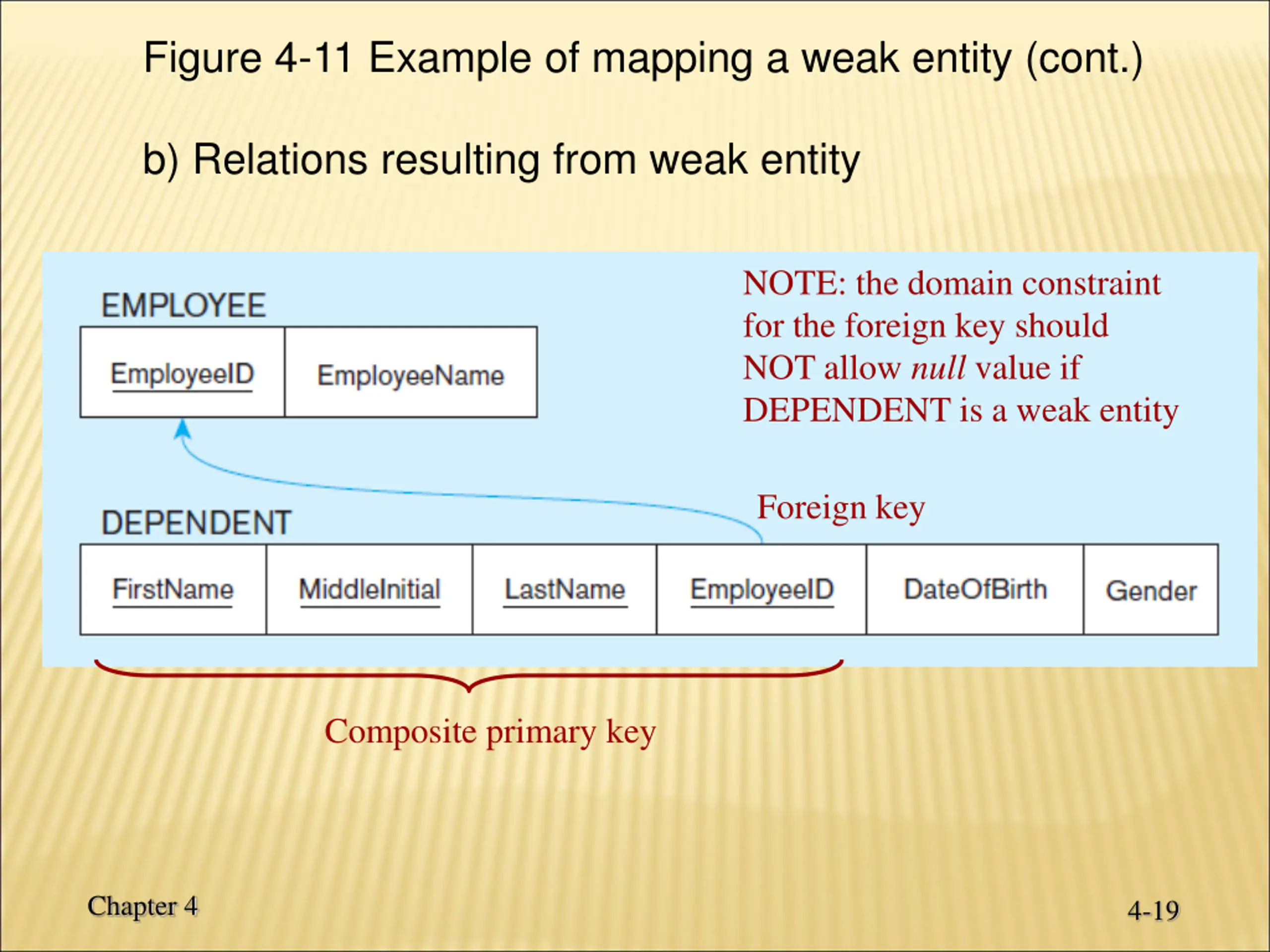 Figure 4-11 Example of mapping a weak entity (cont.) b) Relations resulting from weak entity NOTE: the domain constraint for the foreign key should NOT allow null value if DEPENDENT is a weak entity Foreign key Composite primary key Chapter 4 4-19