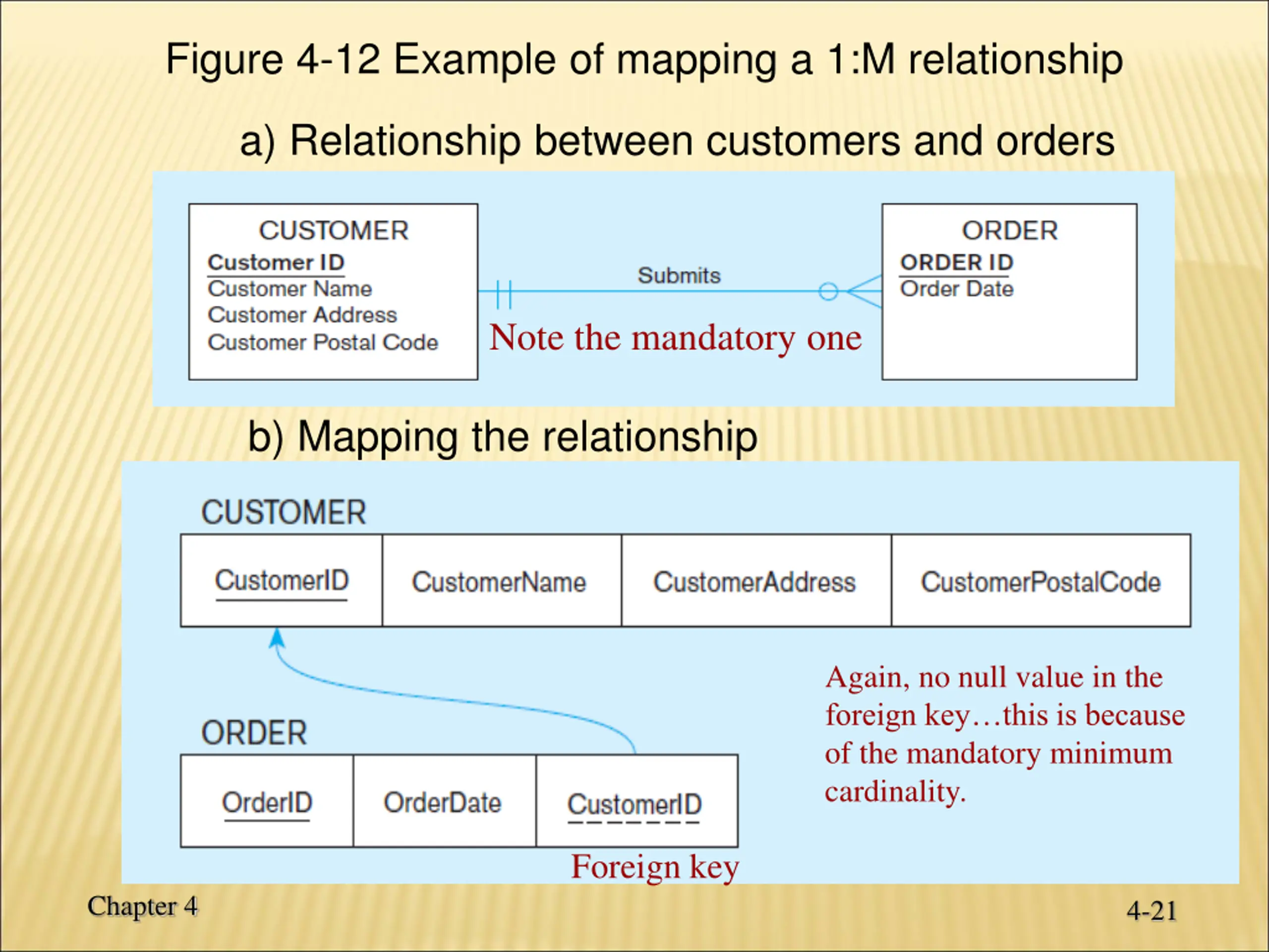 Figure 4-12 Example of mapping a 1:M relationship a) Relationship between customers and orders Note the mandatory one b) Mapping the relationship Again, no null value in the foreign key this is because of the mandatory minimum cardinality. Foreign key Chapter 4 4-21