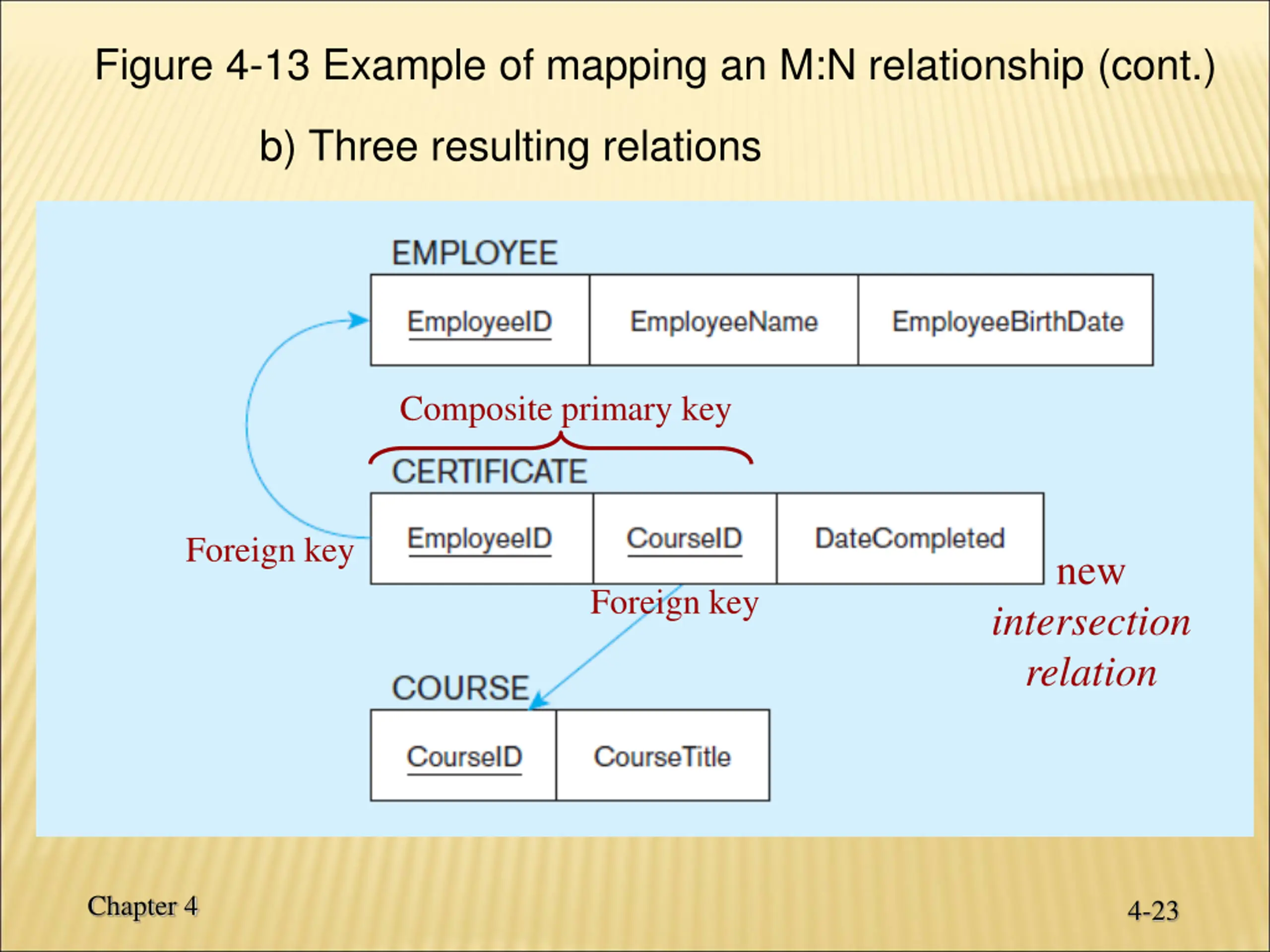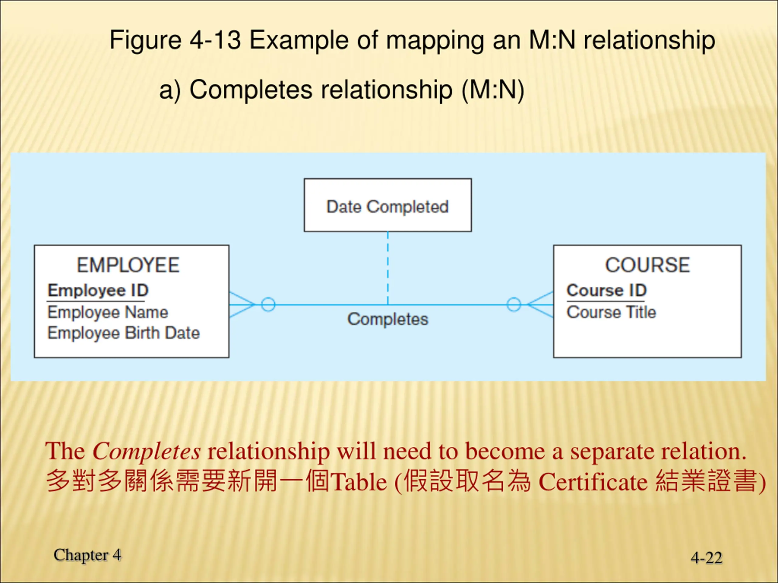 Figure 4-13 Example of mapping an M:N relationship a) Completes relationship (M:N) The Completes relationship will need to become a separate relation. Table ( Certificate ) Chapter 4 4-22