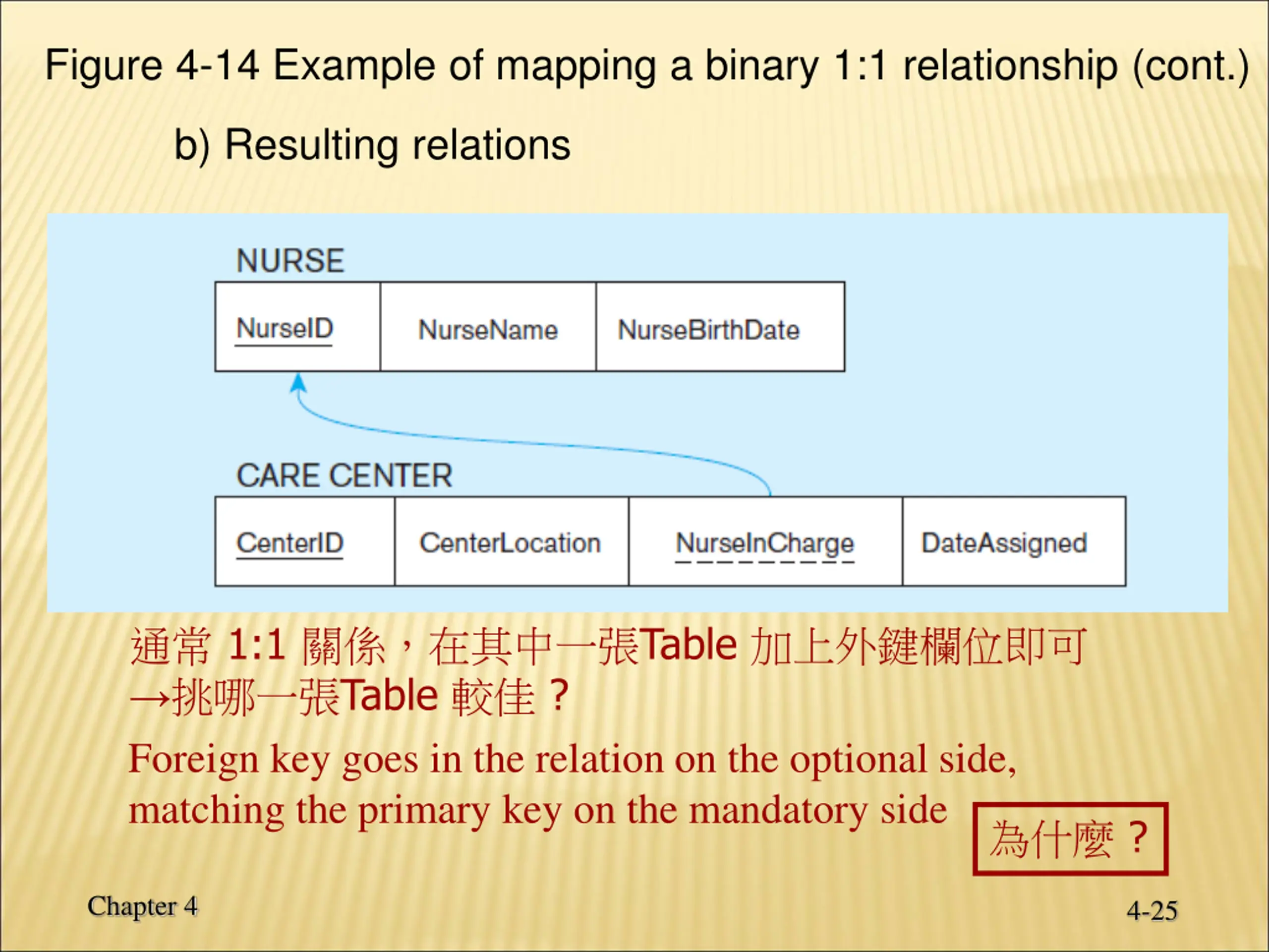 Figure 4-14 Example of mapping a binary 1:1 relationship (cont.) b) Resulting relations 1:1 Table Table ? Foreign key goes in the relation on the optional side, matching the primary key on the mandatory side ? Chapter 4 4-25