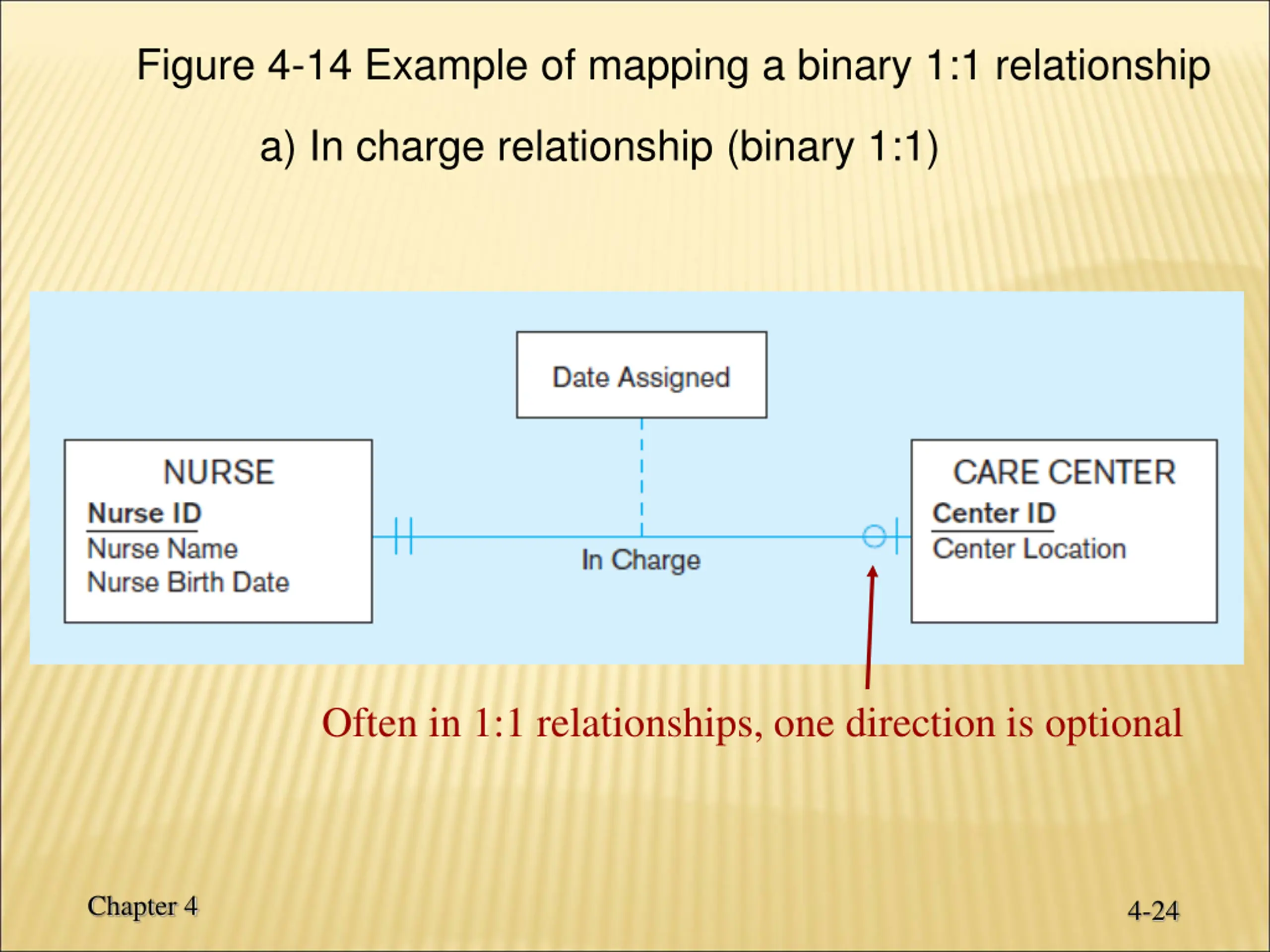 Figure 4-14 Example of mapping a binary 1:1 relationship a) In charge relationship (binary 1:1) Often in 1:1 relationships, one direction is optional Chapter 4 4-24