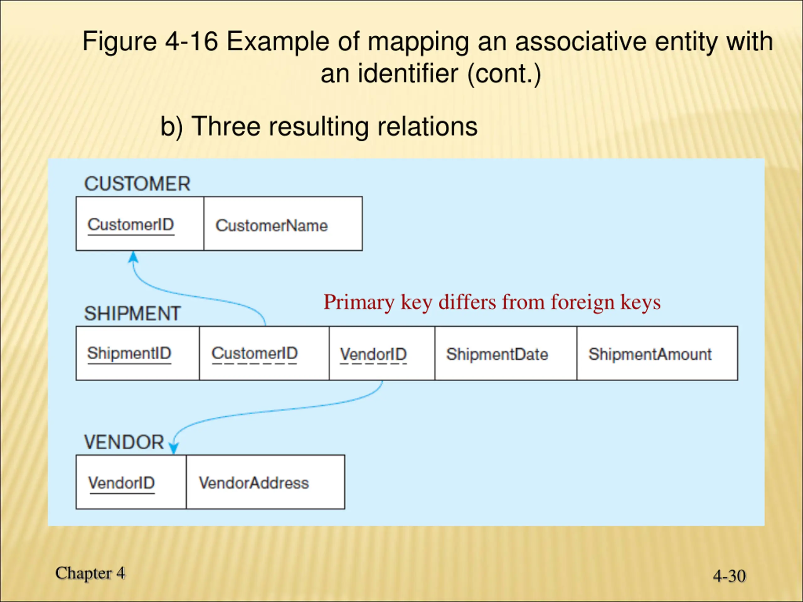 Figure 4-16 Example of mapping an associative entity with an identifier (cont.) b) Three resulting relations Primary key differs from foreign keys Chapter 4 4-30