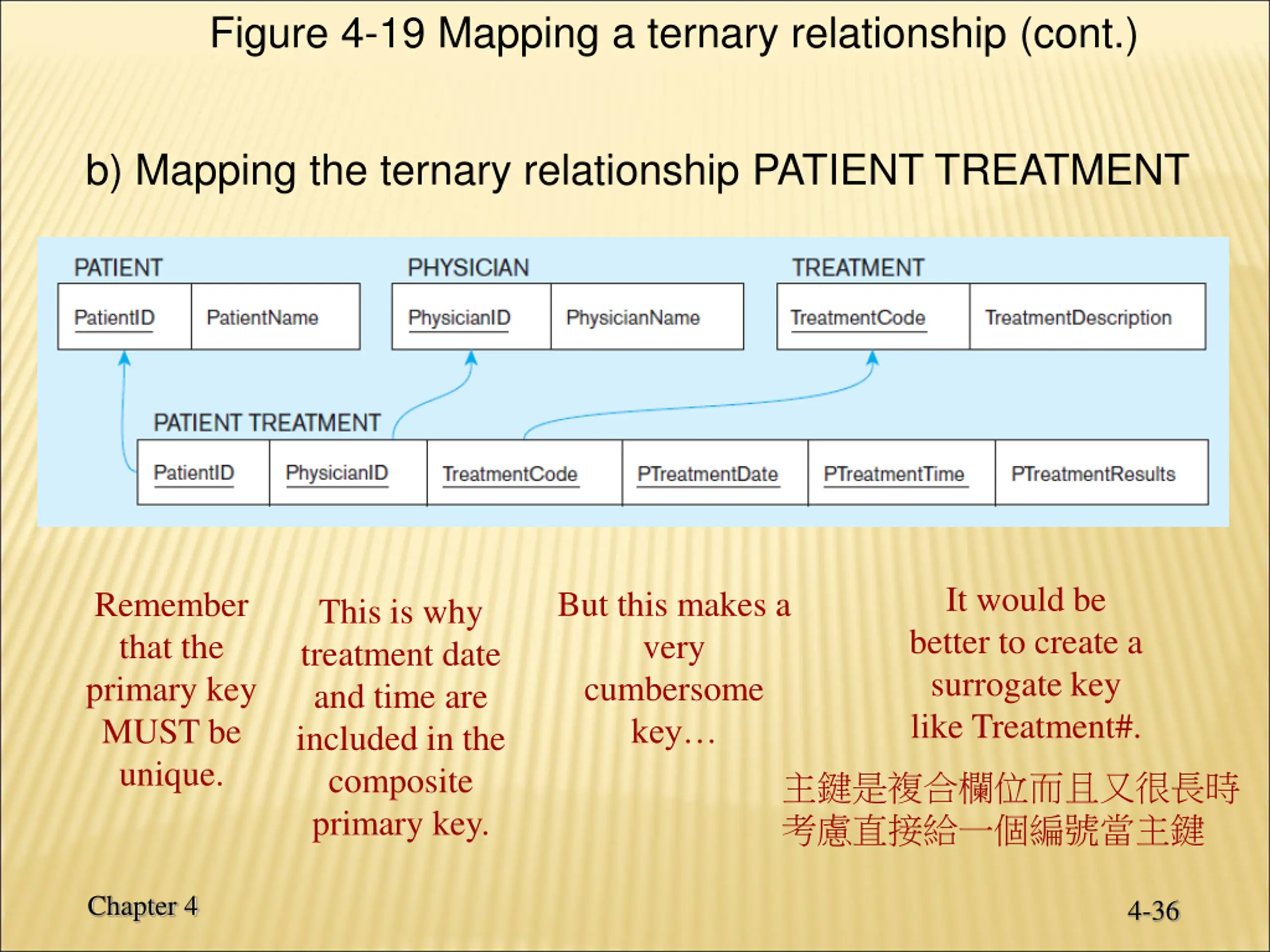 Figure 4-19 Mapping a ternary relationship (cont.) b) Mapping the ternary relationship PATIENT TREATMENT It would be better to create a surrogate key like Treatment#. But this makes a very cumbersome key Remember that the primary key MUST be unique. This is why treatment date and time are included in the composite primary key. Chapter 4 4-36
