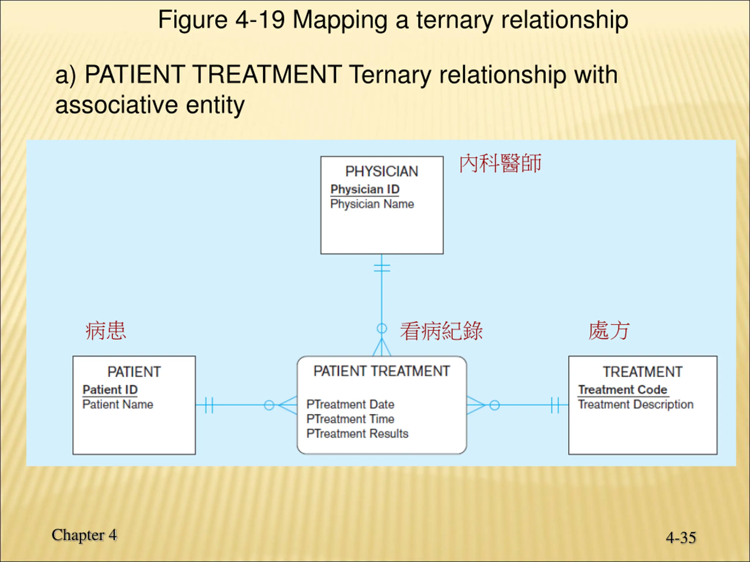 Figure 4-19 Mapping a ternary relationship a) PATIENT TREATMENT Ternary relationship with associative entity Chapter 4 4-35