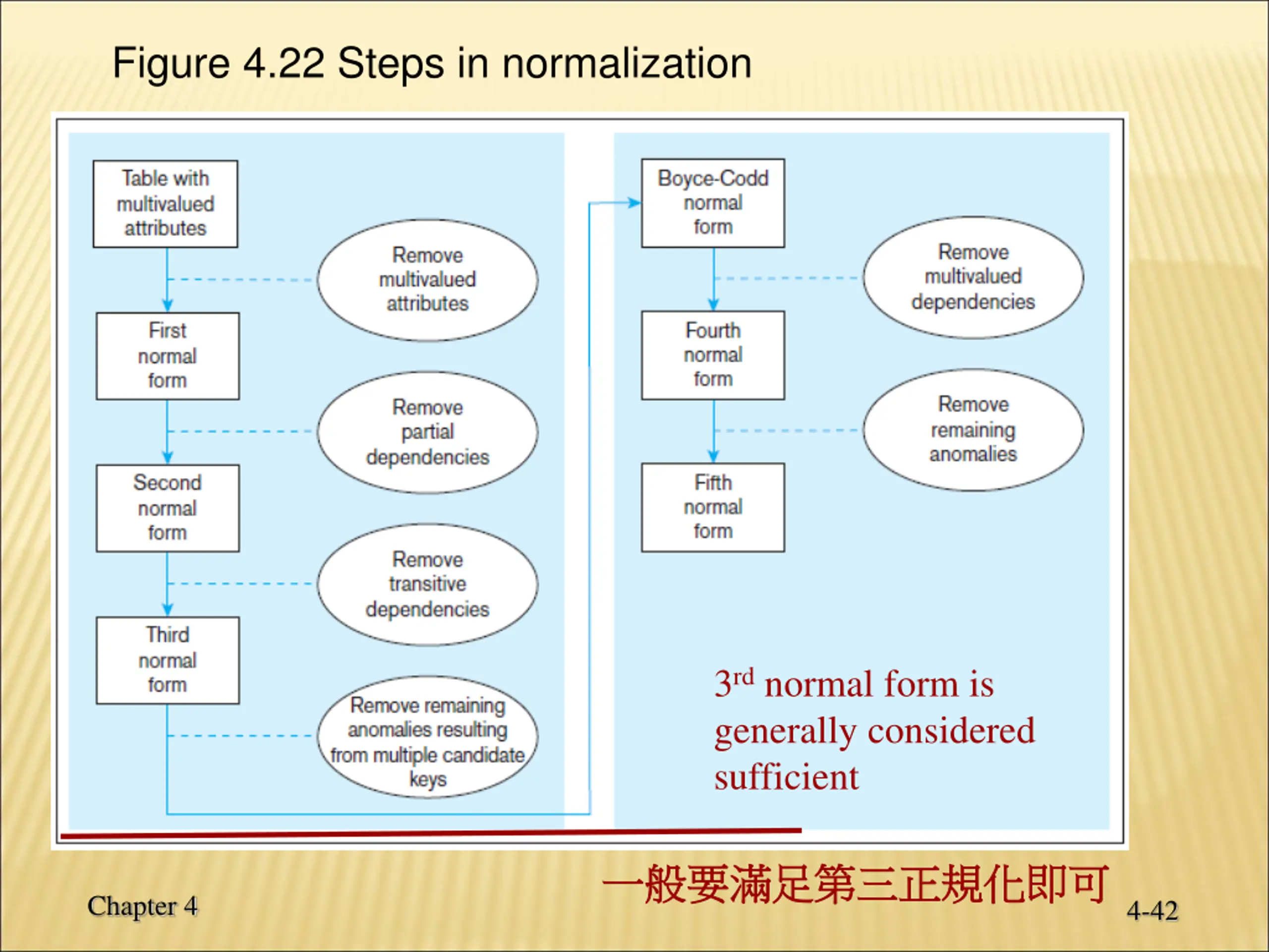 Figure 4.22 Steps in normalization 3rd normal form is generally considered sufficient Chapter 4 4-42