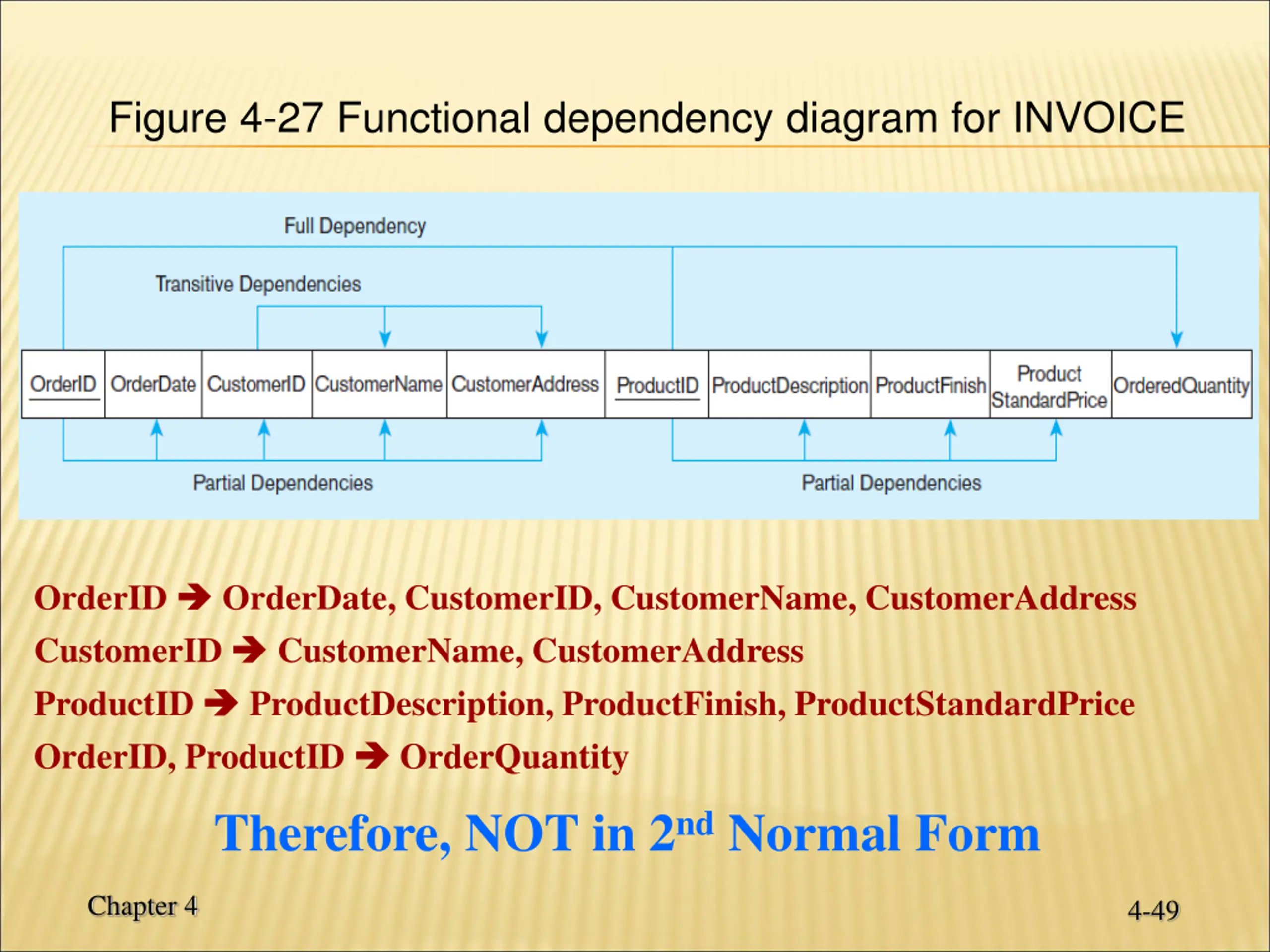 Figure 4-27 Functional dependency diagram for INVOICE OrderID CustomerID ProductID OrderID, ProductID OrderDate, CustomerID, CustomerName, CustomerAddress CustomerName, CustomerAddress ProductDescription, ProductFinish, ProductStandardPrice OrderQuantity Therefore, NOT in 2nd Normal Form Chapter 4 4-49