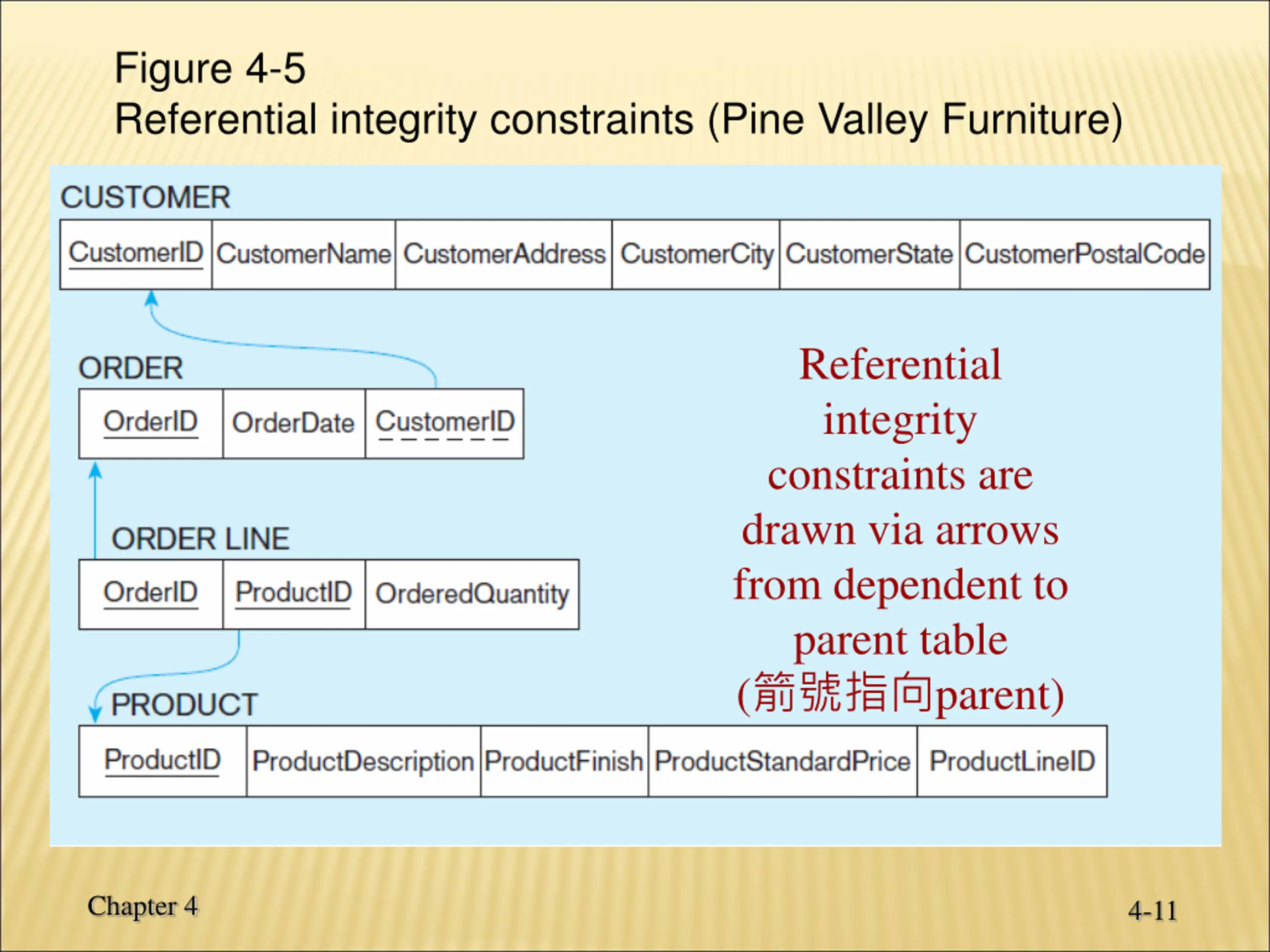 Figure 4-5 Referential integrity constraints (Pine Valley Furniture) Referential integrity constraints are drawn via arrows from dependent to parent table ( parent) Chapter 4 4-11