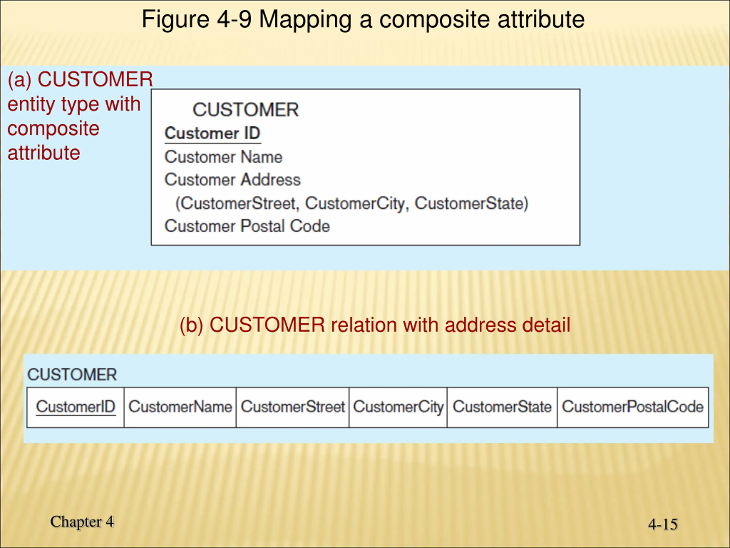 Figure 4-9 Mapping a composite attribute (a) CUSTOMER entity type with composite attribute (b) CUSTOMER relation with address detail Chapter 4 4-15