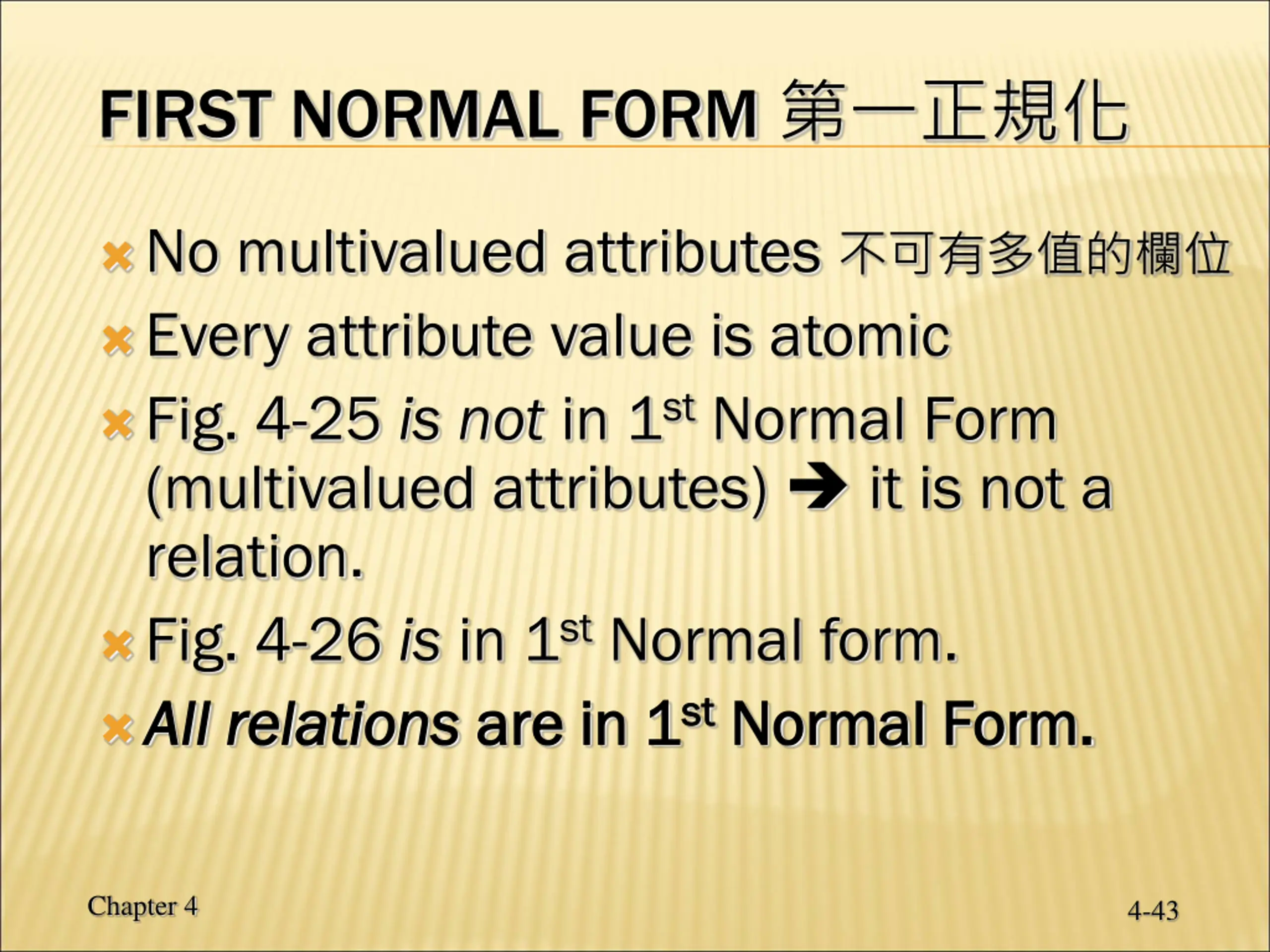 FIRST NORMAL FORM No multivalued attributes Every attribute value is atomic Fig. 4-25 is not in 1st Normal Form (multivalued attributes) it is not a relation. Fig. 4-26 is in 1st Normal form. All relations All relations are in 1 are in 1st st Normal Form. Normal Form. Chapter 4 4-43