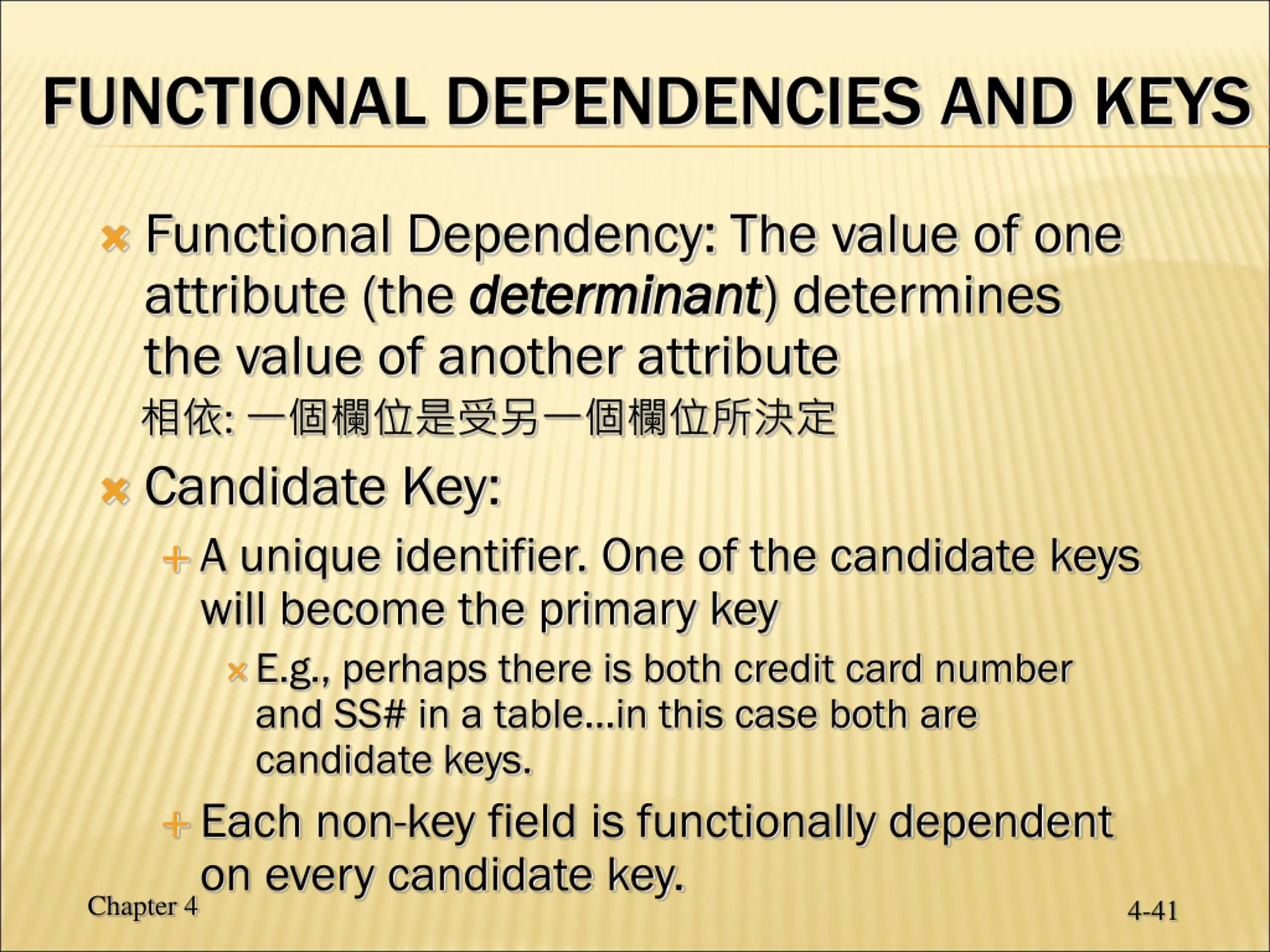 FUNCTIONAL DEPENDENCIES AND KEYS Functional Dependency: The value of one attribute (the determinant determinant) determines the value of another attribute : Candidate Key: A unique identifier. One of the candidate keys will become the primary key E.g., perhaps there is both credit card number and SS# in a table in this case both are candidate keys. Each non-key field is functionally dependent on every candidate key. Chapter 4 4-41