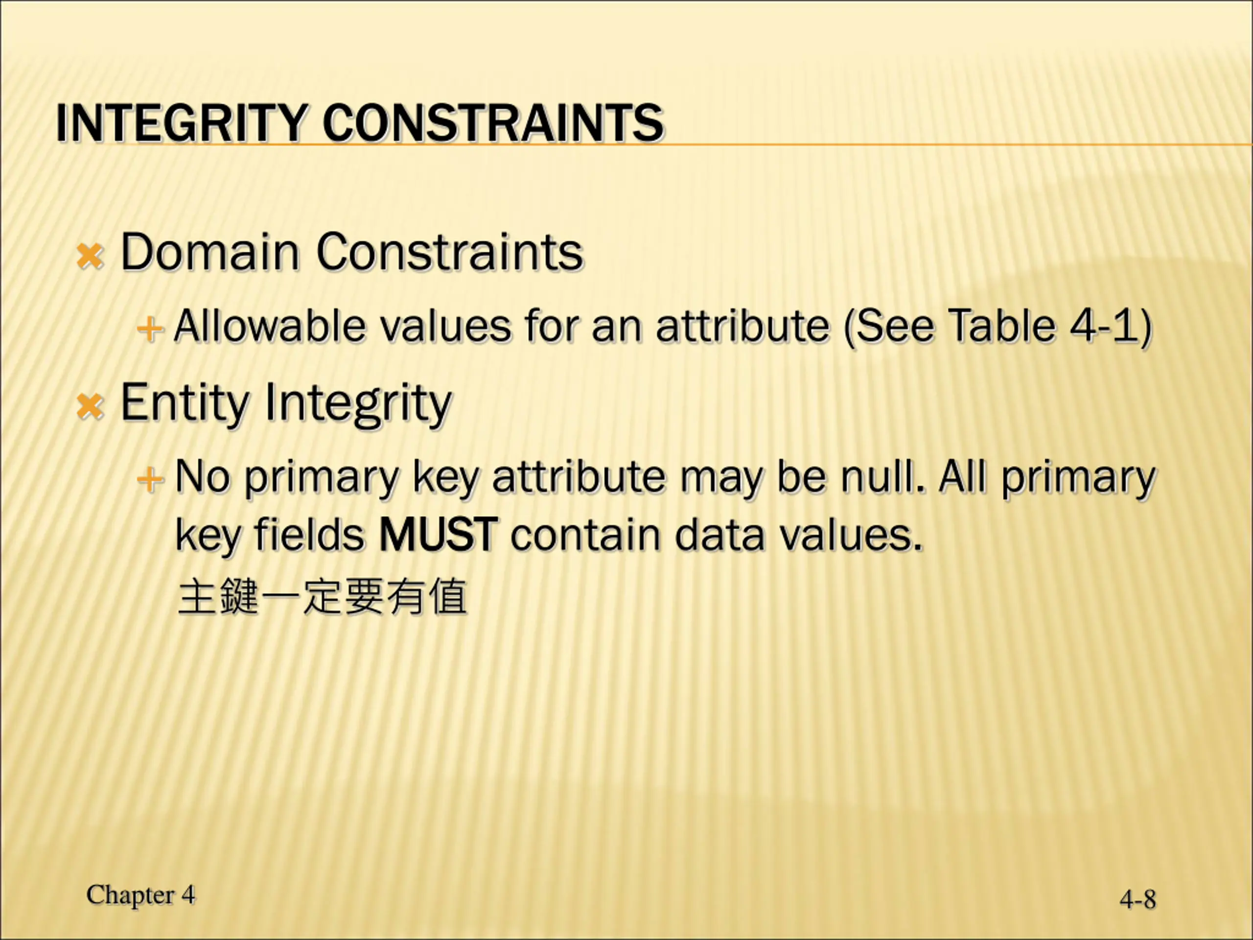 Domain definitions enforce domain integrity constraints. Chapter 4 4-9