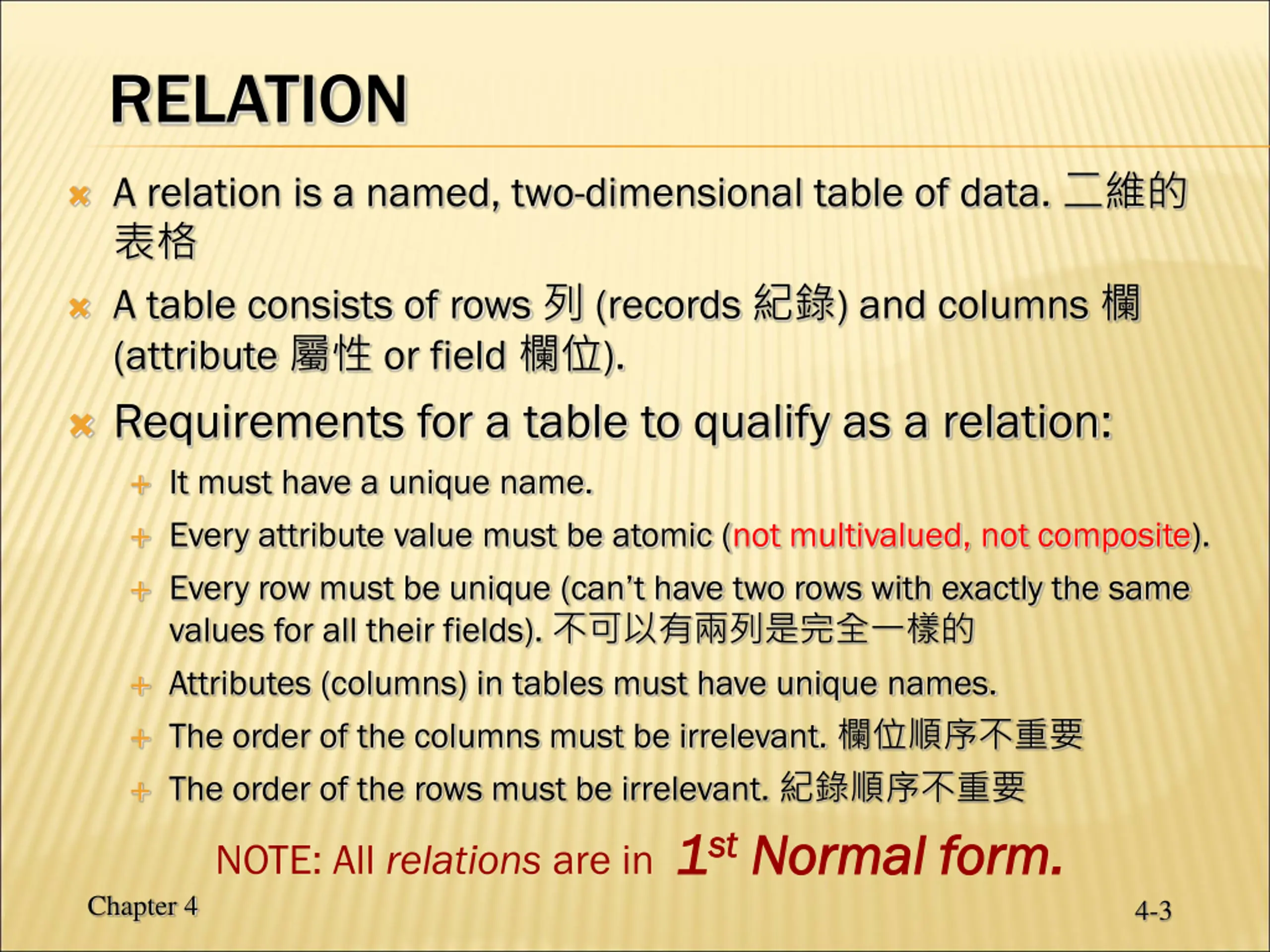 RELATION A relation is a named, two-dimensional table of data. A table consists of rows (records ) and columns (attribute or field ). Requirements for a table to qualify as a relation: It must have a unique name. Every attribute value must be atomic (not multivalued, not composite). Every row must be unique (can t have two rows with exactly the same values for all their fields). Attributes (columns) in tables must have unique names. The order of the columns must be irrelevant. The order of the rows must be irrelevant. NOTE: All relations are in 1 1st st Normal form. Normal form. Chapter 4 4-3