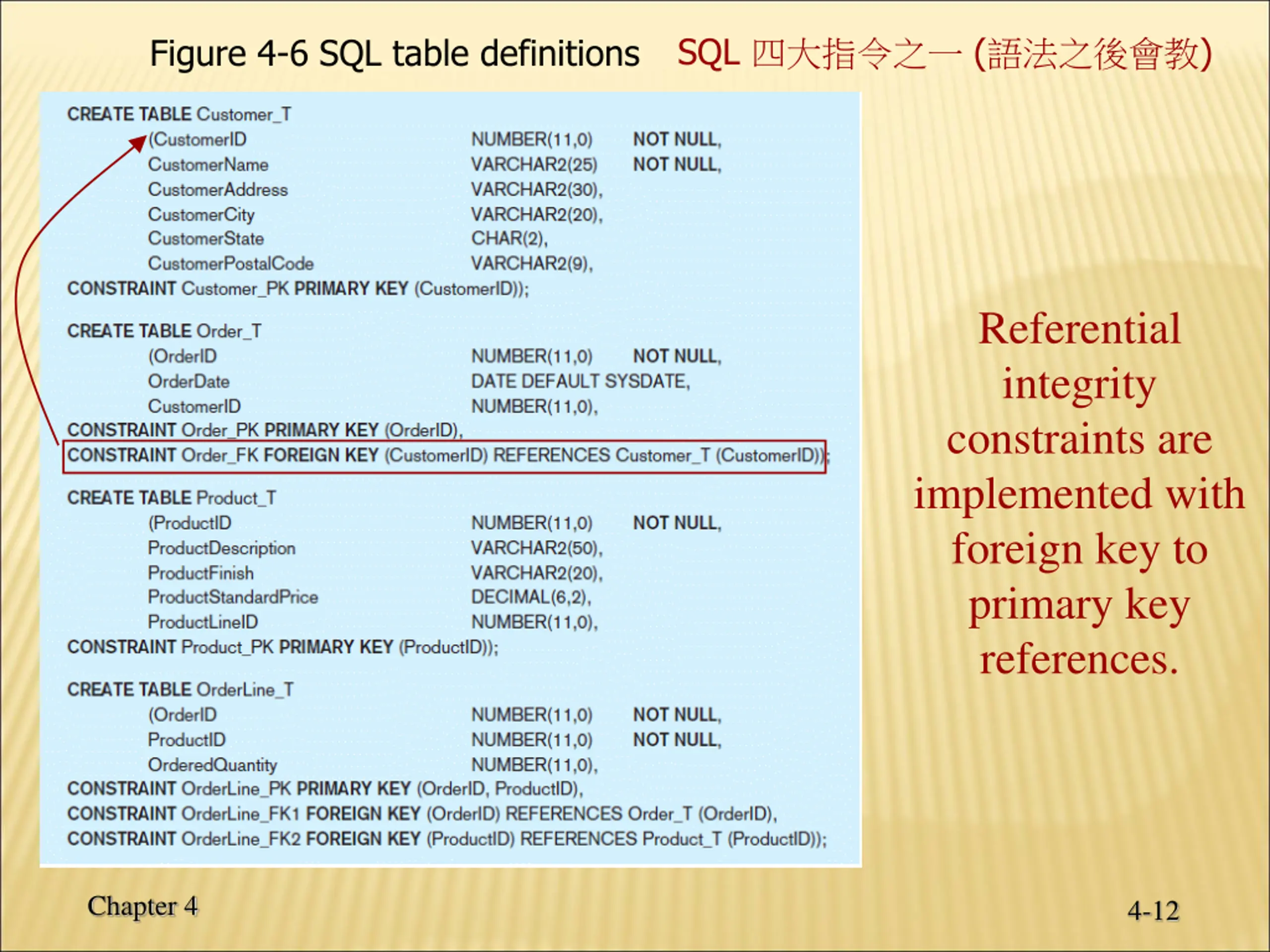SQL () Figure 4-6 SQL table definitions Referential integrity constraints are implemented with foreign key to primary key references. Chapter 4 4-12
