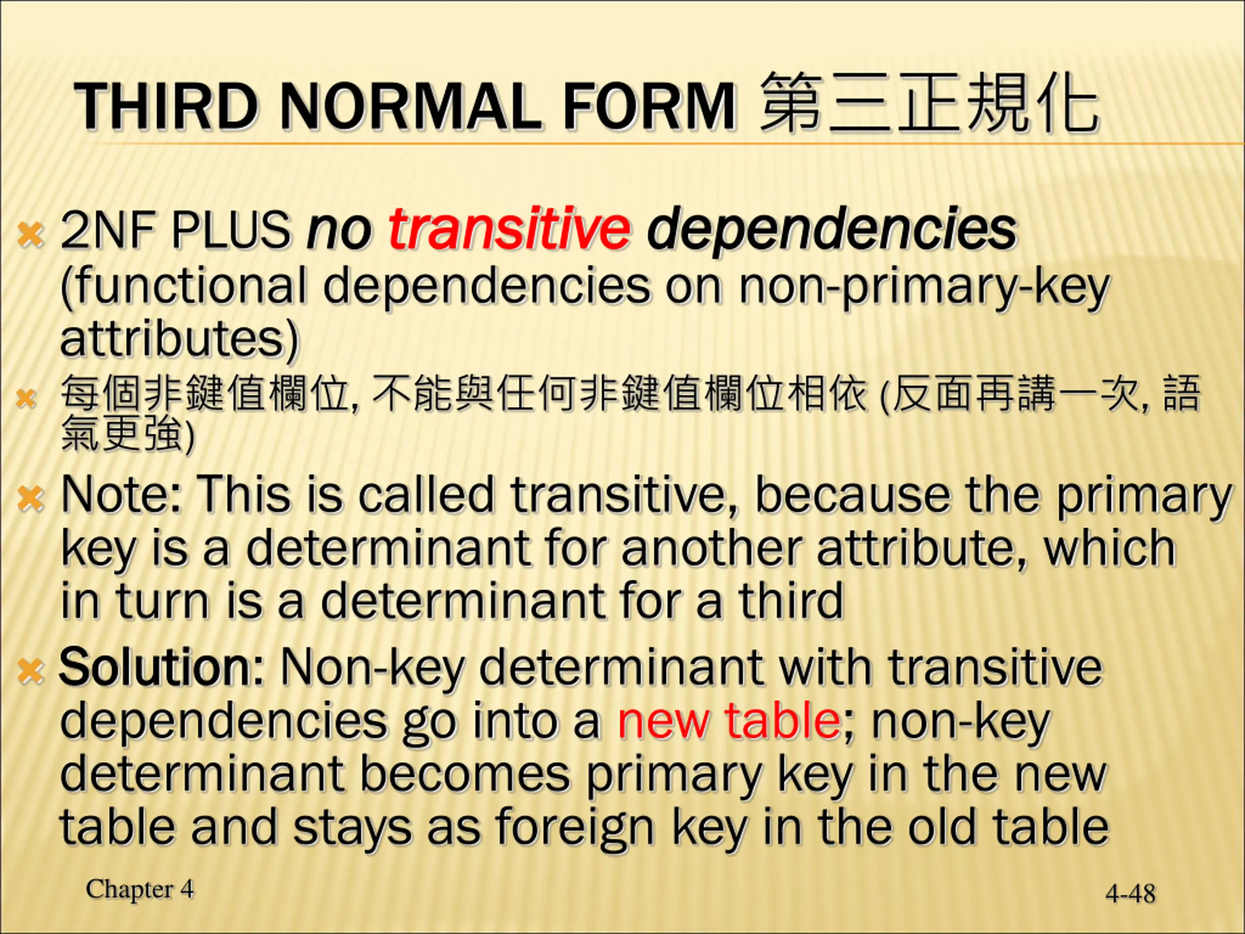 SECOND NORMAL FORM 1NF PLUS every non functionally dependent on the functionally dependent on the ENTIRE primary key primary key Every non-key attribute must be defined by the entire key, not by only part of the key No partial partial functional dependencies every non- -key attribute is fully key attribute is fully ENTIRE Chapter 4 4-47