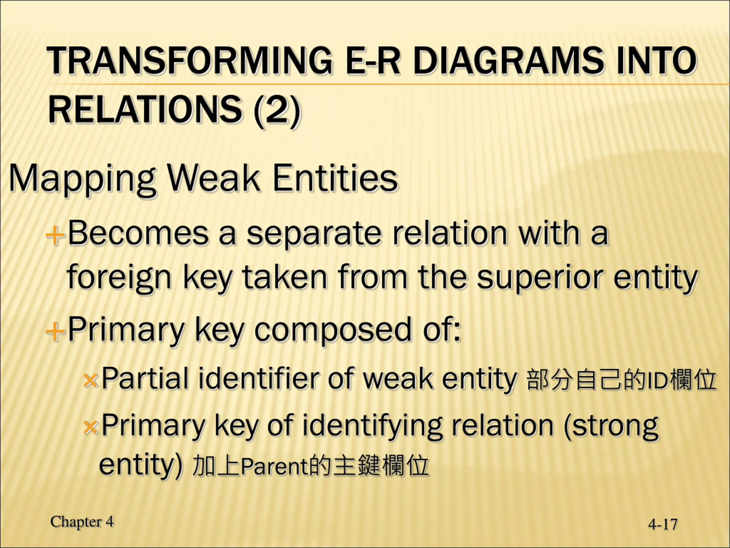 TRANSFORMING E-R DIAGRAMS INTO RELATIONS (2) Mapping Weak Entities Becomes a separate relation with a foreign key taken from the superior entity Primary key composed of: Partial identifier of weak entity ID Primary key of identifying relation (strong entity) Parent Chapter 4 4-17