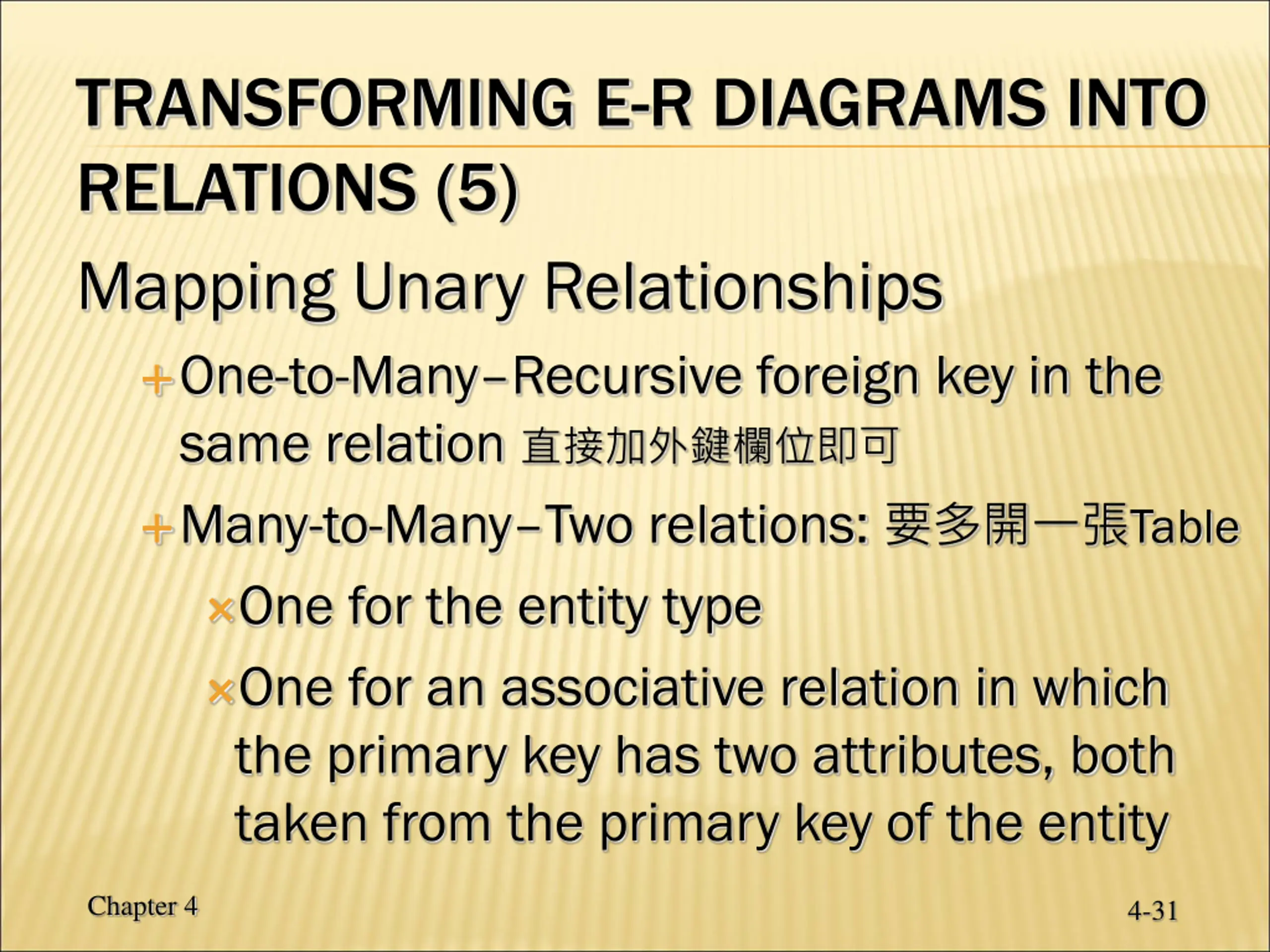 TRANSFORMING E-R DIAGRAMS INTO RELATIONS (5) Mapping Unary Relationships One-to-Many Recursive foreign key in the same relation Many-to-Many Two relations: Table One for the entity type One for an associative relation in which the primary key has two attributes, both taken from the primary key of the entity Chapter 4 4-31