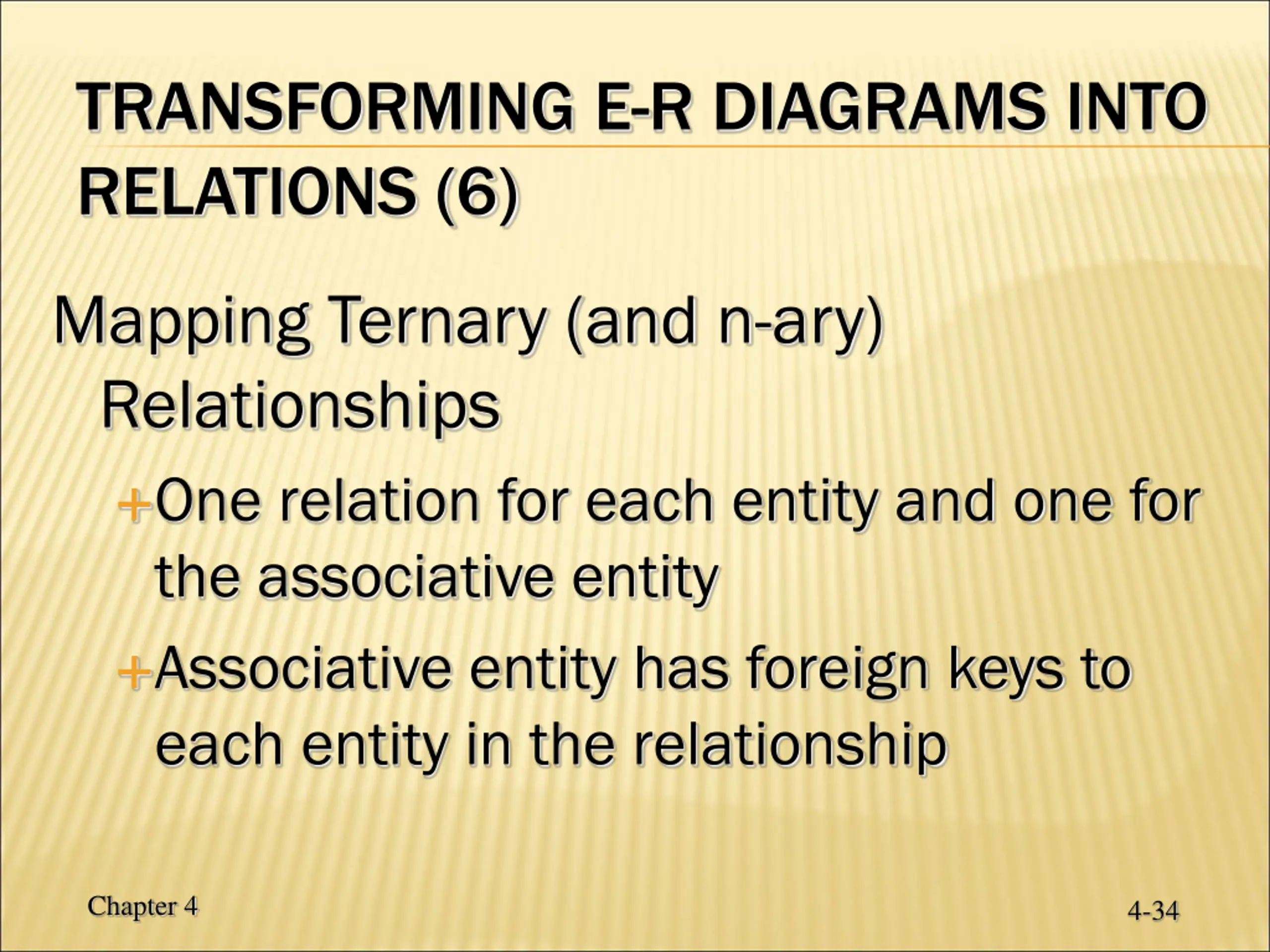 TRANSFORMING E-R DIAGRAMS INTO RELATIONS (6) Mapping Ternary (and n-ary) Relationships One relation for each entity and one for the associative entity Associative entity has foreign keys to each entity in the relationship Chapter 4 4-34