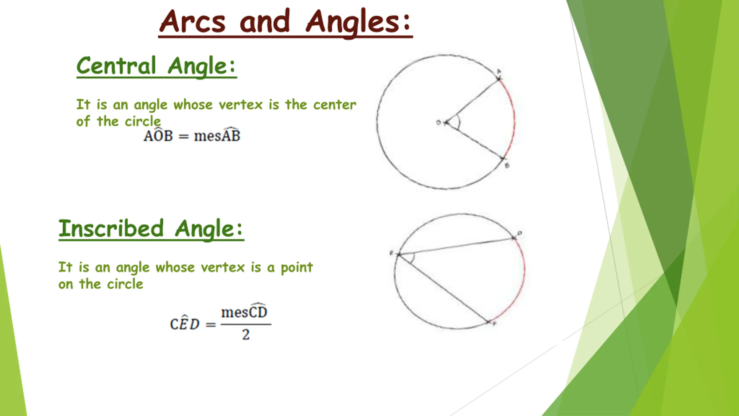 Arcs and Angles: Central Angle: It is an angle whose vertex is the center of the circle Inscribed Angle: It is an angle whose vertex is a point on the circle